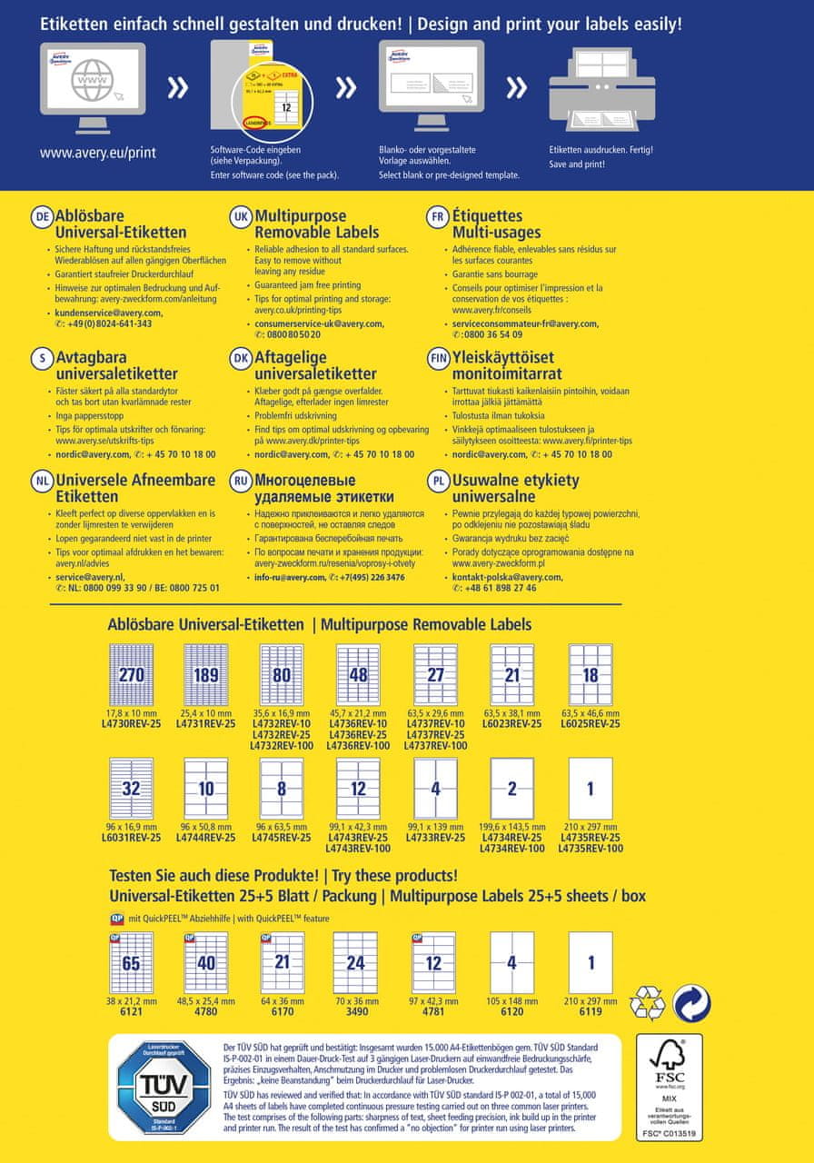 Avery Zweckform odstranljive univerzalne etikete L6023REV-25 so bele barve, velikost etiket je 63.5 × 38.1 mm. Nalepke imajo odstranljivo lepilo in se jih lahko enostavno in brez sledi odstrani. Primerne so za začasno označevanje in pogosto spreminjajoče napise. V zavitku je 525 etiket + 105 brezplačnih etiket. Etikete so okolju prijazne: imajo certifikat FSC. Za tiskanje so primerni običajni laserski in inkjet tiskalniki. Za oblikovanje etiket priporočamo uporabo brezplačnega spletnega programa Avery Design & Print.