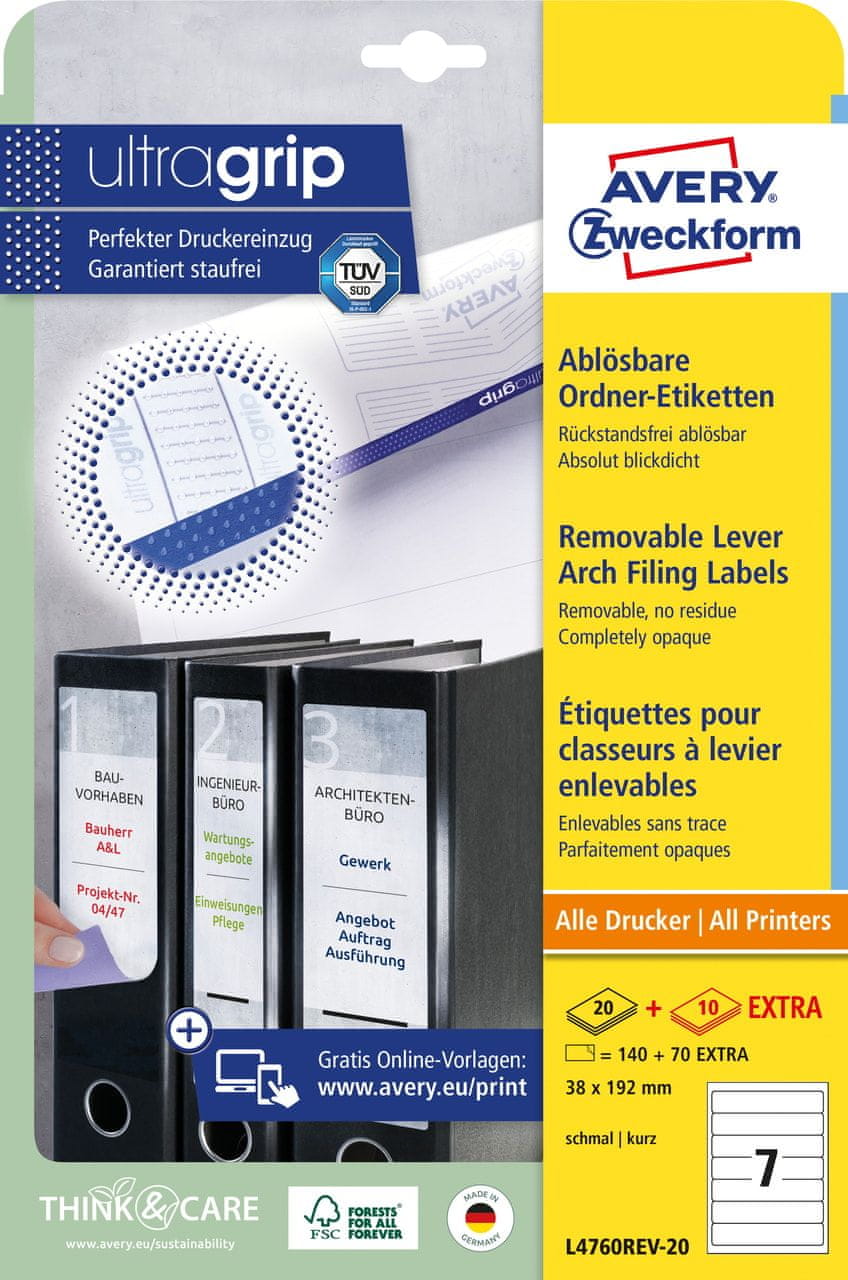 Avery Zweckform odstranljive etikete za registratorje L4760REV-20 so popolnoma neprosojne in prekrijejo stari tekst – vaše registratorje boste lahko ponovno uporabili. Etikete so velike 192 × 38 mm. V zavitku je 140 etiket + 70 brezplačnih etiket. Imajo dober oprijem in se jih lahko enostavno odstrani, ker imajo odstranljivo lepilo. Izdelane so s tehnologijo ultragrip, ki zagotavlja natančno postavitev lista v tiskalniku in tiskanje brez zatikanja. Etikete so okolju prijazne: imajo certifikat FSC. Za tiskanje so primerni običajni laserski in inkjet tiskalniki. Etikete lahko oblikujete z brezplačnim spletnim programom Avery Design & Print.