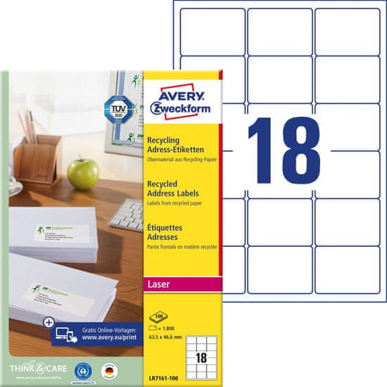 Avery Zweckform reciklirane etikete LR7161-100, 63.5 x 46.6 mm, naravno bele, 1800 etiket/zavitek, A4, za tiskanje