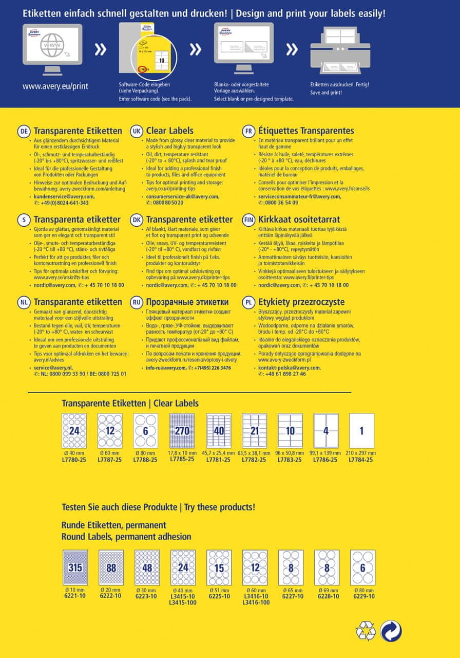 Avery Zweckform svetleče transparentne etikete L7783–25 proizvodom za prodajo, darilnim vrečkam in mapam dajo eleganten videz. Velikost etiket je 96 × 50.8 mm. V zavitku je 25 listov, vseh etiket je 250. Nalepke so odporne na umazanijo, vlago in mehanske poškodbe. Imajo permanentno lepilo, ki ima dober oprijem na raznih podlagah. Za oblikovanje etiket priporočamo uporabo brezplačnega spletnega programa Avery Design & Print. Etikete so primerne za tiskanje z barvnimi in črno-belimi laserskimi tiskalniki.