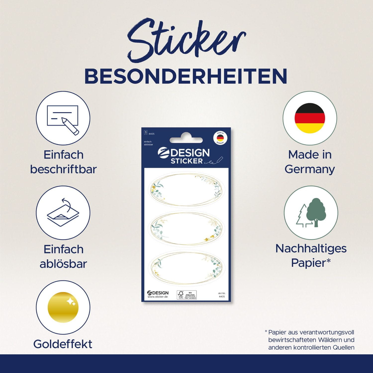 Praktične in lepe nalepke. Z njimi hitro in enostavno označite vse vrste predmetov, tako doma kot na delovnem mestu. Etikete imajo odstranljivo lepilo. Avery Zweckform ovalne nalepke s trendovskimi cvetličnimi okvirji niso le lepe, ampak tudi praktične. Po njih lahko ročno pišete z vsemi standardnimi pisali! Etikete lahko uporabite na primer za kozarčke z marmelado ali drugih dobrot iz vaše kuhinje. Uporabite jih lahko tudi za označitev škatel ali drugih odlagalnih posod: steklenic, posod za sol, riž ali moko, škatlic za drobnarije. Odlične so tudi kot nalepke za darila in šopke: ponujajo dovolj prostora za napis imena in ljubeče osebno sporočilo ali čestitko. Te etikete so še posebej primerne v času praznovanj, kot so božič, novo leto, obletnice in poroke. Ko smo že pri porokah in praznovanjih: preprosto napišite ime gosta na nalepko, nalepite jo na prtiček, kozarec ali jedilni list in že imate urejen sedežni red za mizo. Bodite prilagodljivi! Bi radi steklenico kisa ponovno uporabili in vanjo natočili domač bezgov sirup? Boste v škatlo z gumbi raje pospravili darilne trakove? Ni problema! Te odstranljive nalepke lahko preprosto odstranite, ne da bi ostajali ostanki lepila – odstranite torej staro nalepko in jo zamenjajte z novo. Nalepke so izdelane iz trajnostnega papirja in so zaradi reliefnega zlatega okvirja videti še posebej elegantne.