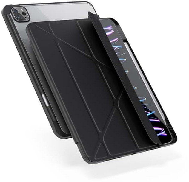 Ovitek zagotavlja celovito zaščito tabličnega računalnika pred mehanskimi poškodbami in umazanijo. Izdelan je iz kombinacije trpežnega TPU okvirja, ki blaži udarce, in prozorne hrbtne strani iz polikarbonata, ki ohranja viden originalni dizajn in logotip naprave. Funkcionalnost povečuje vgrajeno zložljivo stojalo, ki omogoča stabilno postavitev tablice za udobno gledanje vsebin ali delo. V notranjosti je posebej oblikovana vdolbina za shranjevanje pisala Apple Pencil, natančni izrezi pa zagotavljajo neoviran dostop do vseh gumbov in priključkov.