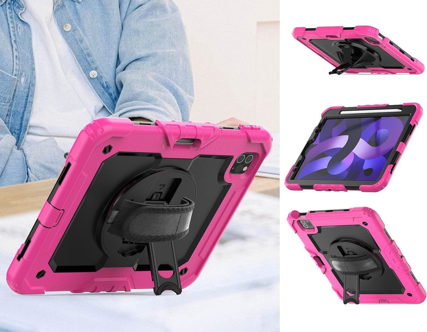 Nikcorp Vzdržljiv zaščitni etui za iPad Pro 11/Air 5/4 z vrtljivim stojalom, držalom za pisalo in ramenskim pasom, roza