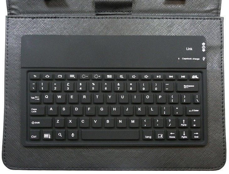 Univerzalna tablična torbica z vgrajeno tipkovnico. Tipkovnica je v angleškem jeziku brez slovenskih znakov. Torbica iz umetnega usnja je čvrsta in odporna. Tablico na mestu drži pet nosilcev, od katerih je eden premičen, zato ga je mogoče prilagoditi višini tablice. Zaprta torbica se zavaruje z elastiko. Na zadnji strani torbice, kamor je nameščena tablica, je stojalo, ki omogoča, da zaslon ostane v pokončnem položaju.