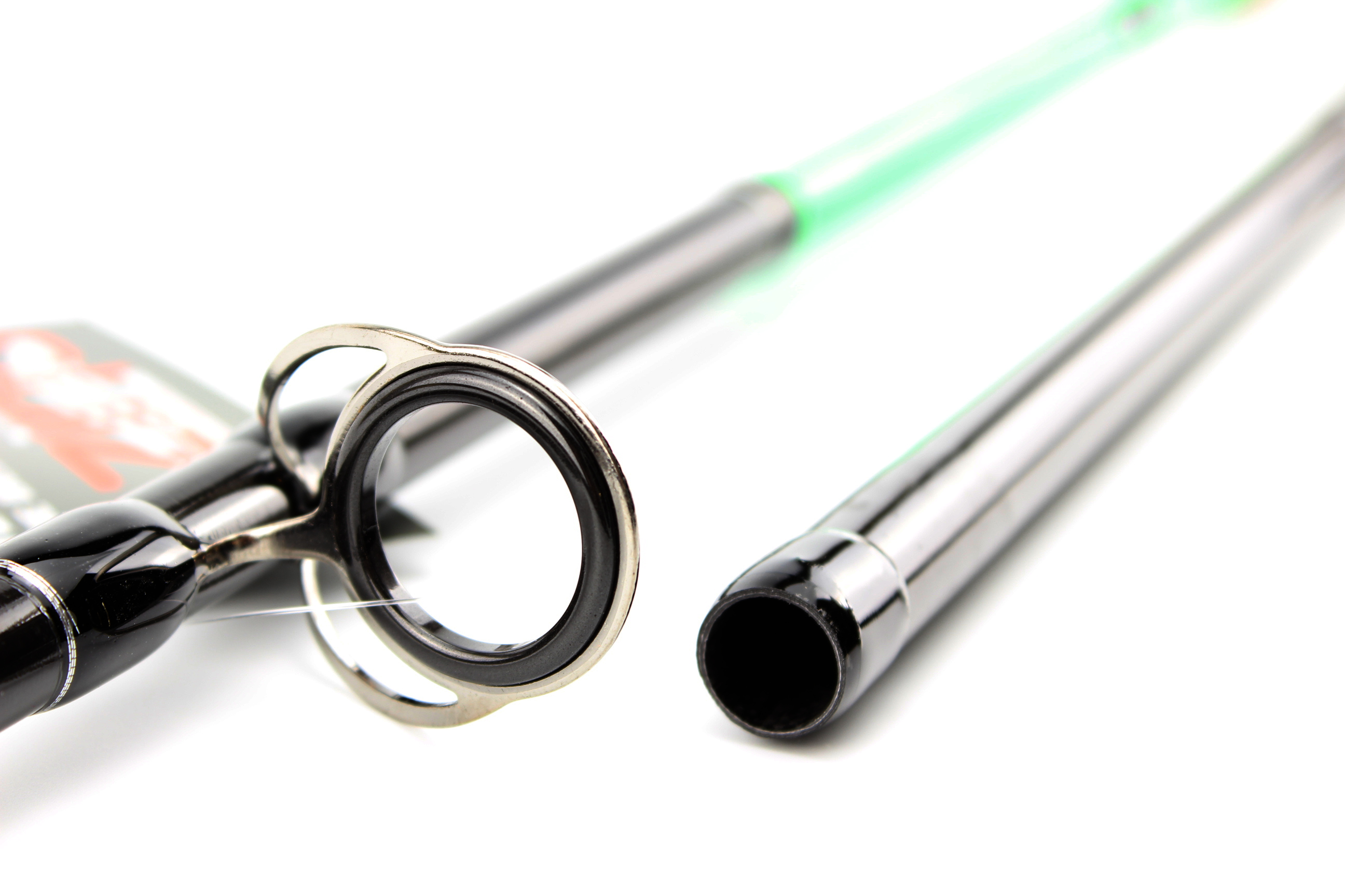 Izdelek je izdelan iz lahkih in trpežnih karbonskih vlaken ter ultra trpežnih SIC vodil, kar omogoča uporabo tako monofilamentnih kot pletenih vrvic. Zadnja stran palice je skrbno prevlečena s pluto, kar zagotavlja udoben oprijem in stabilen nadzor pri izkopu rib.