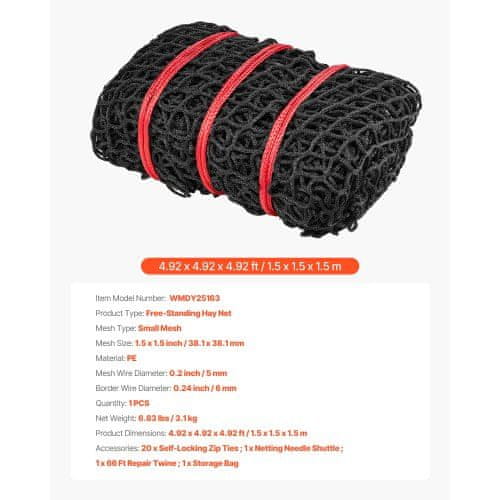 Ta okrogla mreža za seno za počasno hranjenje konj, ki pomaga zmanjšati odpadke in podpira zdravo prebavo. Izdelana iz trpežnega PE z vozlovno zasnovo, zagotavlja varno hranjenje in enostavno rokovanje. Dimenzije: 1,5×1,5×1,5 m. Celoten opis