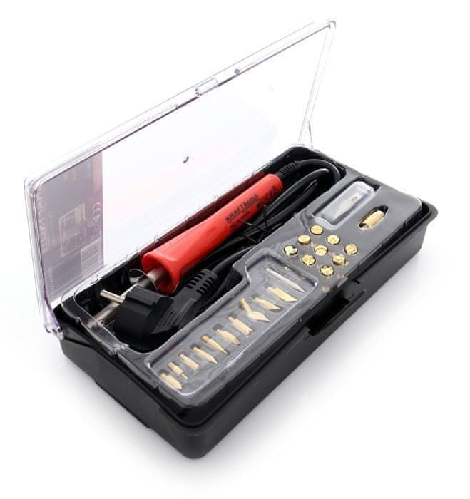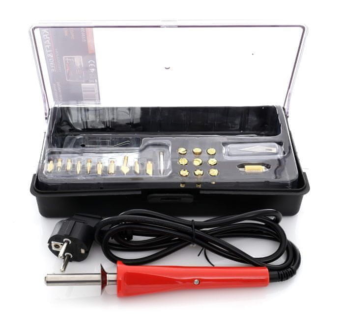 | Lastnosti: • Vrsta naprave: gorilnik na drva in usnje • Napajanje: 230V/50Hz • Moč: 30W • Temperatura: 275°C • Število konic v setu: 22 kosov • Teža kompleta: 0,8 kg |
