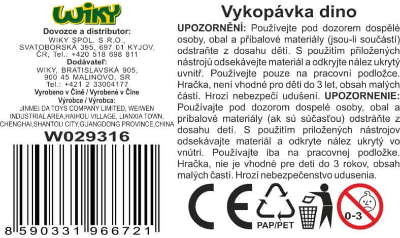 Dino dig. Velikost 16 cm. Veliko jajce z 12 figuricami dinozavrov – 6 dinozavrov in 6 okostij. Paket vsebuje jajce, kladivo, čašo in čopič.