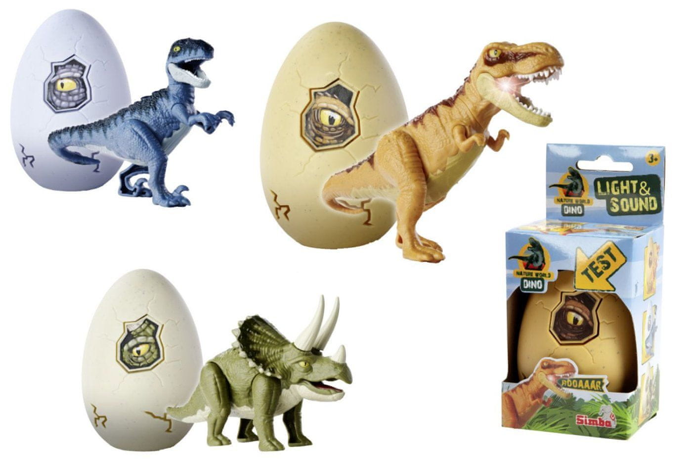 Vsaj jajce vsebuje 14 cm veliko figurico dinozavra, sestavljanko z okostjem dinozavra in navodila. Dinozaver sveti in oddaja zvoke, 3 vrste – T-Rex, Velociraptor, Triceratops.