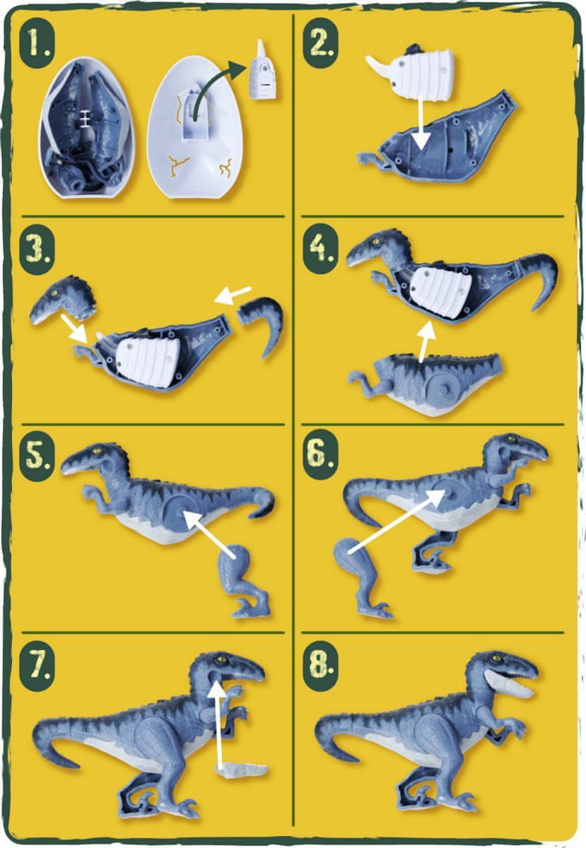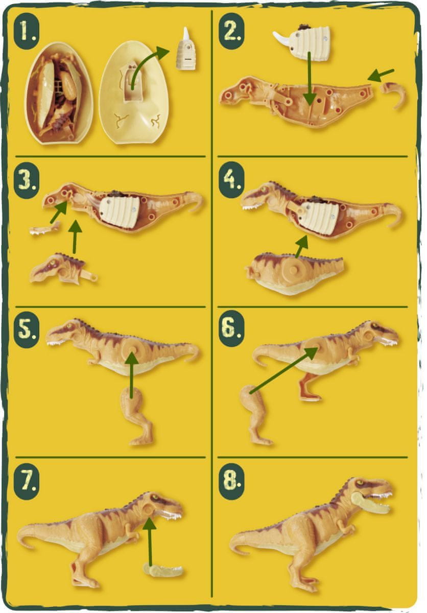 Vsako jajce vsebuje 14 cm veliko figurico dinozavra, sestavljanko z okostjem dinozavra in navodila. Celoten opis