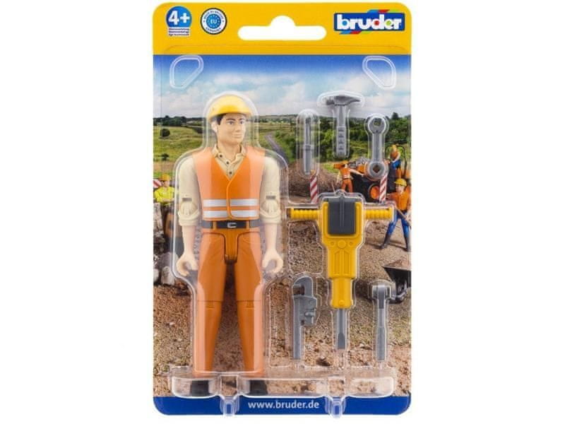 Bruder Bworld Gradbeni delavec je premična figura, ki se dobro prilega kabini tovornjakov, traktorjev in drugih strojev BRUDER. Komplet vključuje figuro s čelado, ki nosi odsevni jopič, in komplet orodja, ki je nujno potrebno pri gradnji, kot so kladivo, izvijač, kladivo ali ključ. Izdelano v Nemčiji iz visokokakovostnih materialov. Glavne značilnosti: sestavljiva figura gradbenega delavca z dodatkiNarejeno v Nemčiji