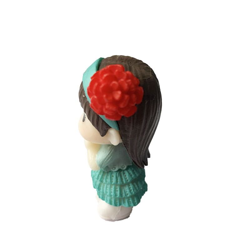 Deklica (punčka) – akvamarin krilo in pulover. Nosi naglavni trak z rdečo rožo.