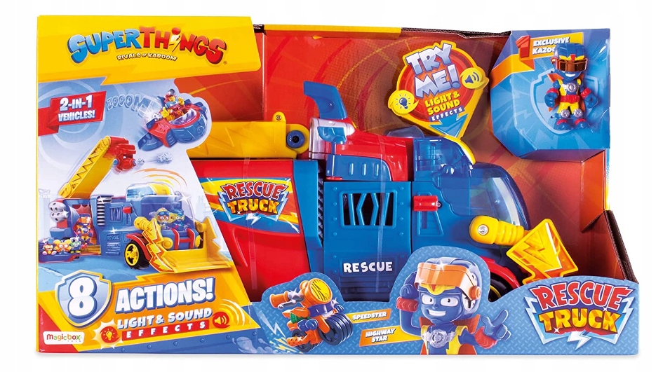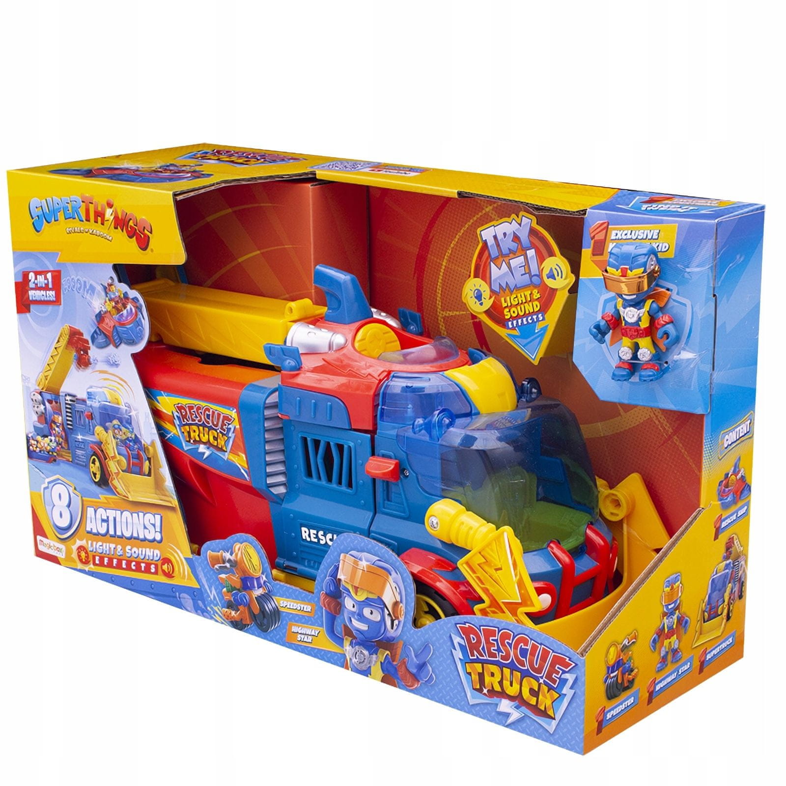 Pogumni liki Super stvari iz najnovejše, 10. serije Reševalnih sil , so opremljeni z odličnim tovornjakom, zasnovanim za posebne naloge! Zahvaljujoč temu vozilu najnovejše generacije se bodo pogumni junaki lahko na še bolj zanimiv in divji način borili proti svojim nasprotnikom, ki pustošijo po mestu Kaboom. Reševalni tovornjak je rdeče-modre barve z rumenimi dodatnimi elementi in je zbirka več manjših strojev. Sprednji odbijač ima del bagra, premična roka pa ima operacijsko postajo Kazoom Kida – uporablja lahko vodni top, ki ga aktivira moder gumb! Kabina ima prozorno vetrobransko steklo, notranjost tovornjaka pa je opremljena s prostorom za majhne figurice SuperZingsov in čarobno energijsko kapsulo!