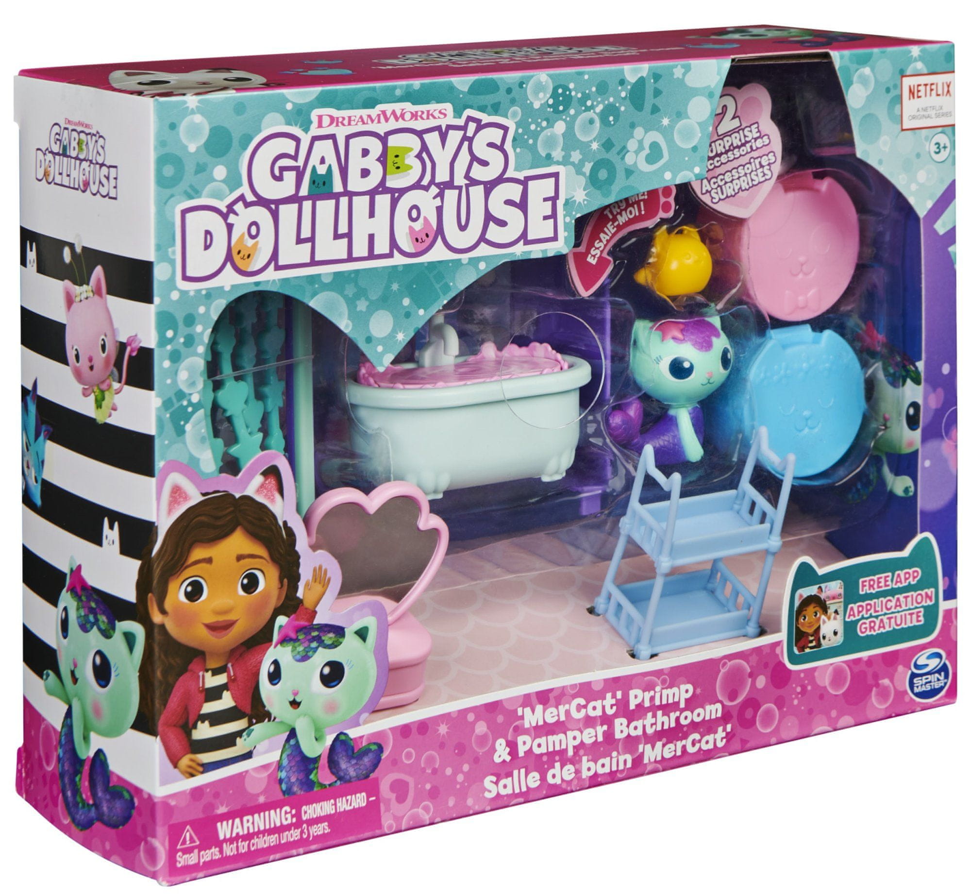 • Čudovita kopalnica Gabby's dollhouse vsebuje 7 elementov – figurico Mercat, pokrivalo, banjico, 2 transportni škatli, 1 lepotilno mizico ter stojalce.