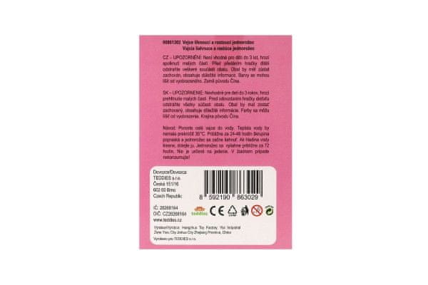V notranjosti jajca se skriva presenečenje v obliki samoroga. Da pa se bo ta iz jajca izvil, ga potopite v skledo z mlačno vodo. V približno 24 do 48 urah bo lupina počila in iz nje se bo začel valiti enorožec. Otroci lahko opazujejo, kako se iz jajca izleže samorog. Izvedeli bodo, kako bo videti čez približno 72 ur. Velikost škatle: 9,5 × 13 cm Primerno za otroke od 3. leta starosti