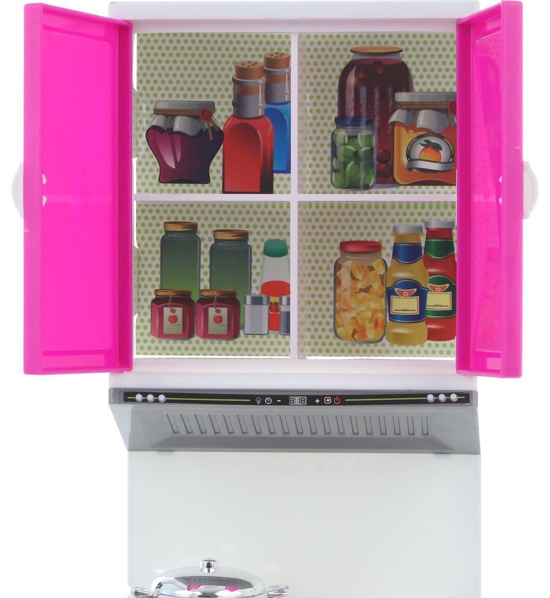 Plastično pohištvo za lutke. Kuhinja s pečico meri 10 × 31 × 7 cm. Linija ima odpirajoča se vrata in vključuje plastične pripomočke. Pečica in kuhalna plošča se prižgejo in oddajajo zvoke. Napajanje 2× LR44 baterije (vključene).