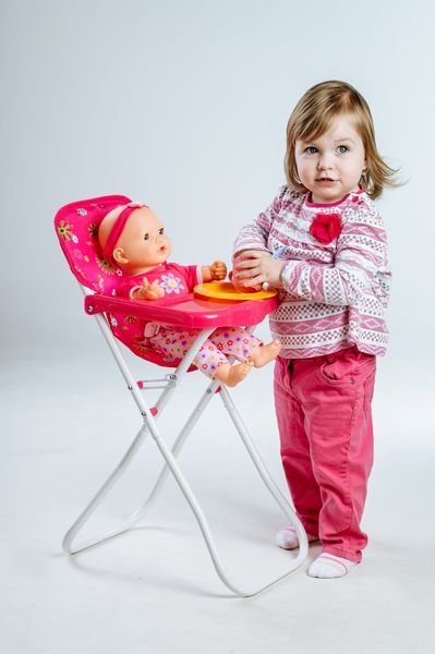 Visok stol z mizico, na kateri lahko deklice hranijo svojo lutko. Velikost: 33 × 26 × 60 cm. Primeren od 3. leta starosti dalje.