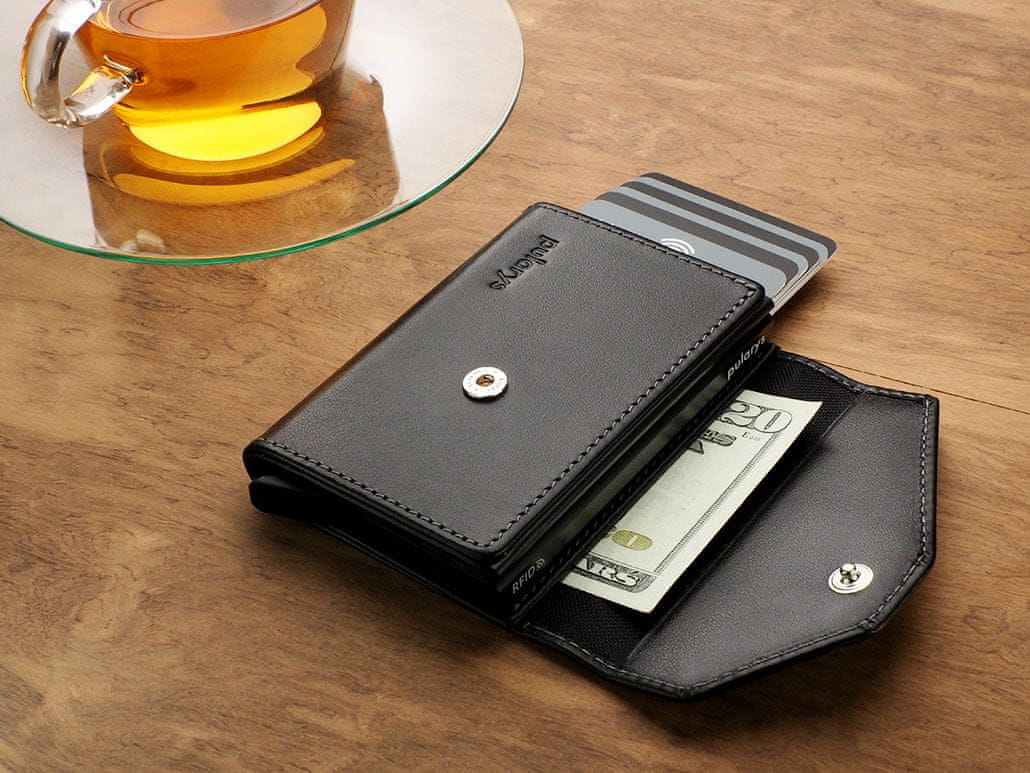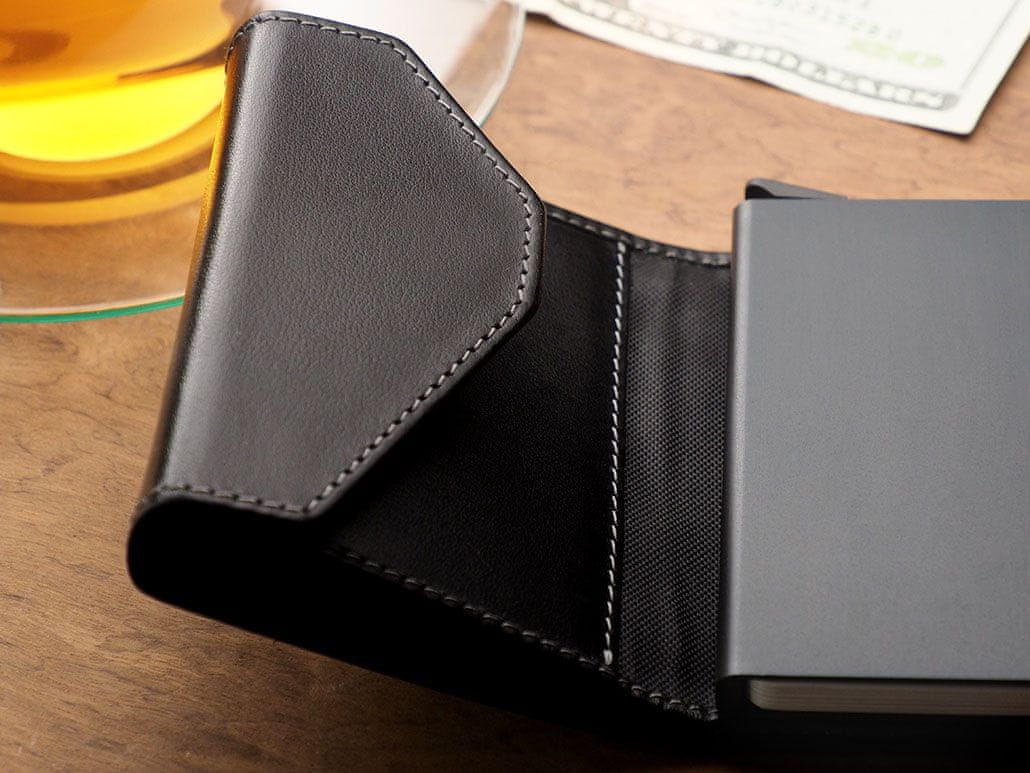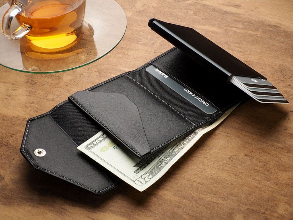 Izdelana iz mehkega na dotik, ekskluzivnega italijanskega usnja. Natančna dodelava in subtilni šivi bodo zadovoljili vsakega ljubitelja popolnih detajlov. Velika prostornina: denarnica shrani številne kartice in bankovce ter drobiž v elegantnem notranjem žepu. Enostaven dostop: poseben mehanizem za postopen izmet kartice vam omogoča hiter dostop do tiste, ki jo iščete. Tehnologija blokiranja RFID, vgrajena v zasnovo denarnice, zagotavlja popolno zaščito vaših plačilnih kartic in dokumentov kjer koli in kadar koli. Lahko zadihate – občutljivi osebni podatki in gotovina so zaščiteni pred krajo ali nepooblaščenim skeniranjem.