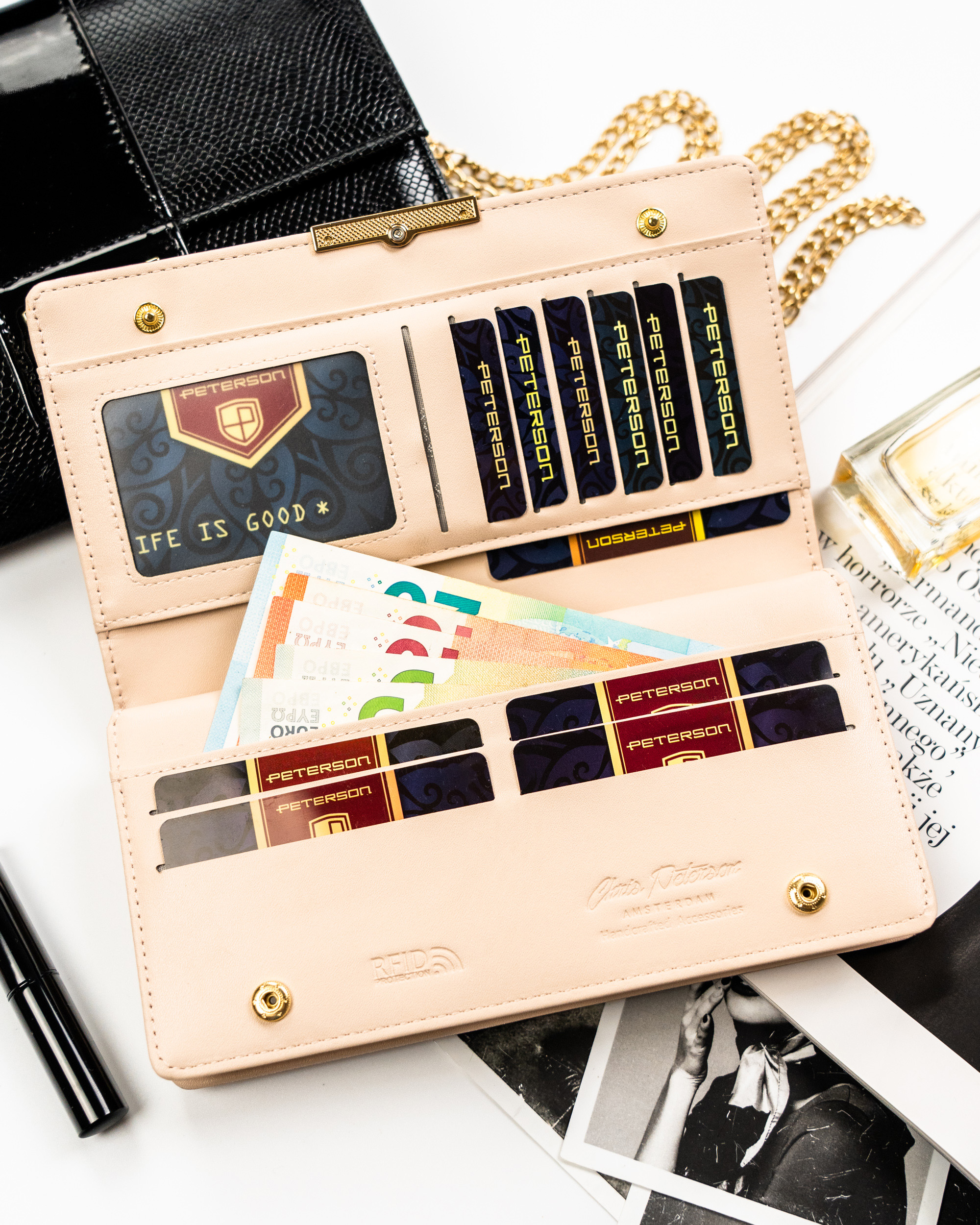Ta elegantna denarnica PETERSON® združuje brezčasno obliko, natančno izdelavo in praktične rešitve, ki jih bo cenila vsaka ženska. Popolna je za vsakodnevno uporabo in posebne priložnosti – navdušuje s svojim videzom in zagotavlja udobje.