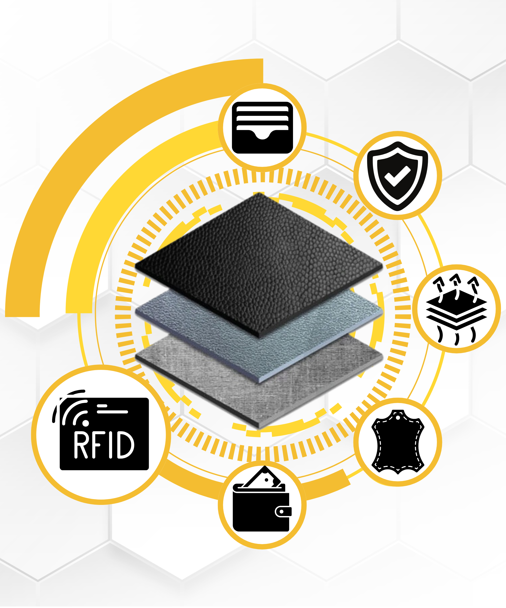 Denarnica opremljena s posebno podlogo s sistemom RFID blokade ( R adio- F frekvenca ID entifikacija), ki ščiti bližinske kartice, biometrične dokumente, osebne izkaznice in kartice za javni prevoz pred nepooblaščenim branjem podatkov . Tehnologija preprečuje branje podatkov s posebnimi bralniki, ki se uporabljajo za krajo podatkov.