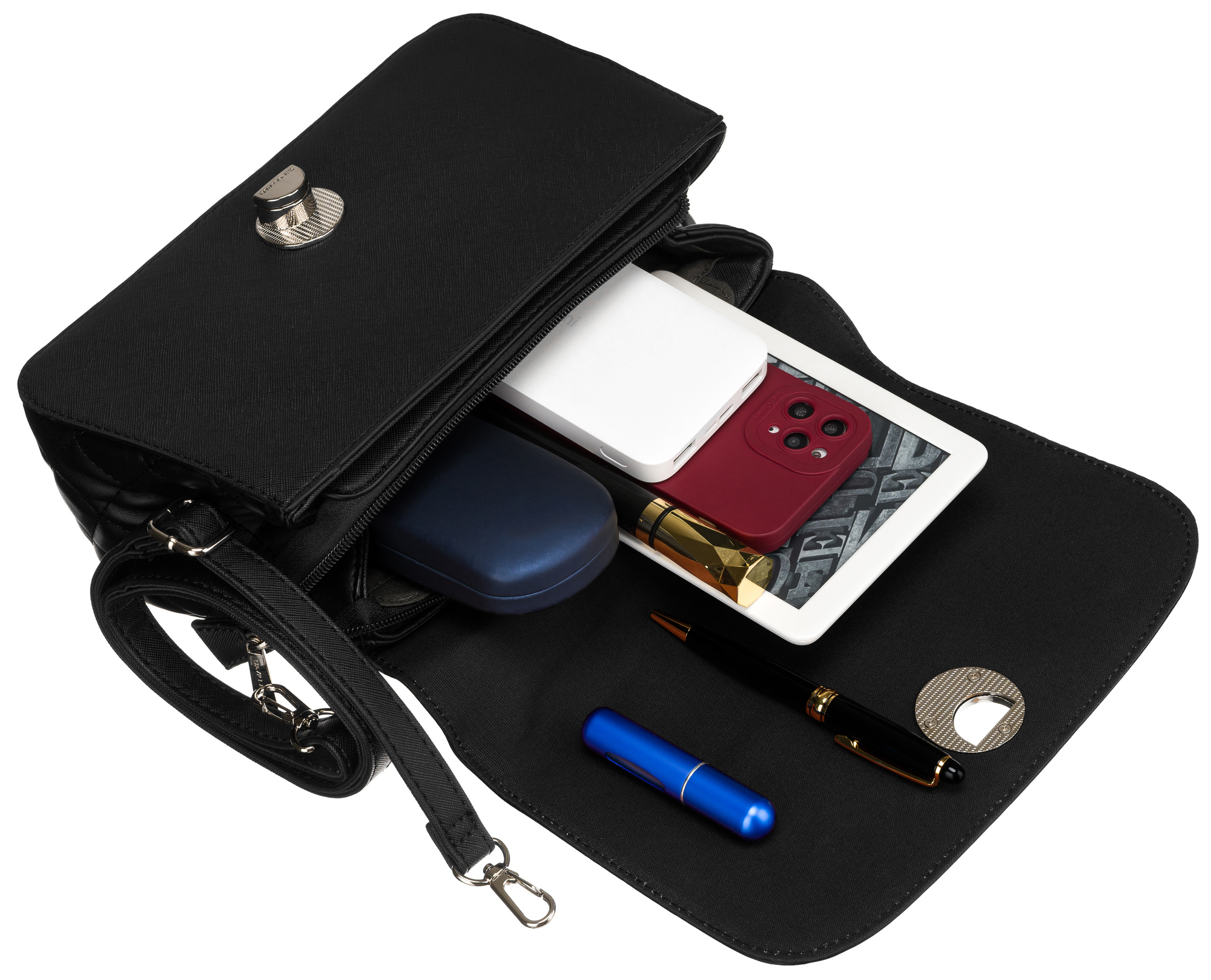 | Torba se zapira z zavihkom s kovinsko, vrtljivo zaponko z logotipom podjetja in zadrgo. Vsa strojna oprema na torbi je čudovite srebrne barve, kar ustvarja odličen kontrast s črno barvo eko usnja. |