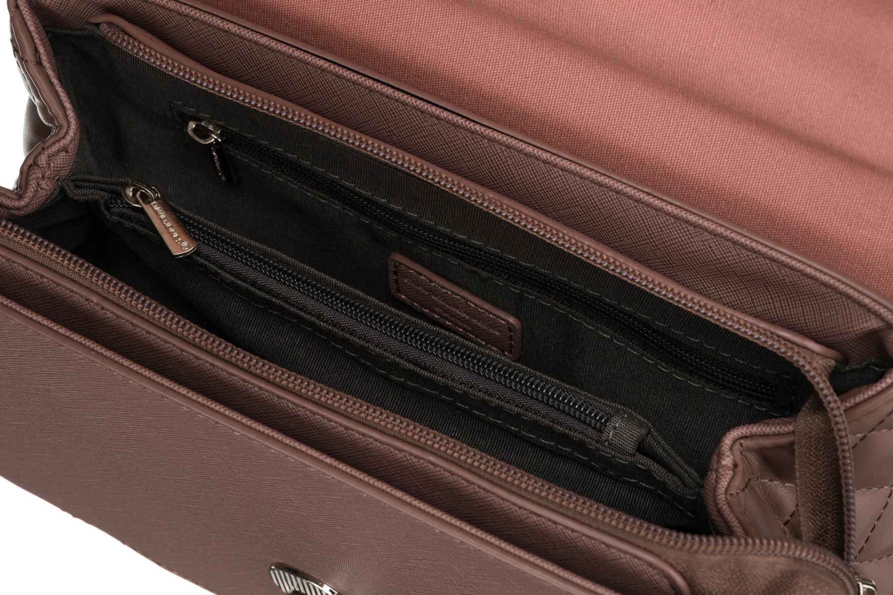 | Torba se zapira z zavihkom s kovinsko, vrtljivo zaponko z logotipom podjetja in zadrgo. Vsa strojna oprema na torbi je čudovite srebrne barve, kar ustvarja odličen kontrast z intenzivno barvo eko usnja. |