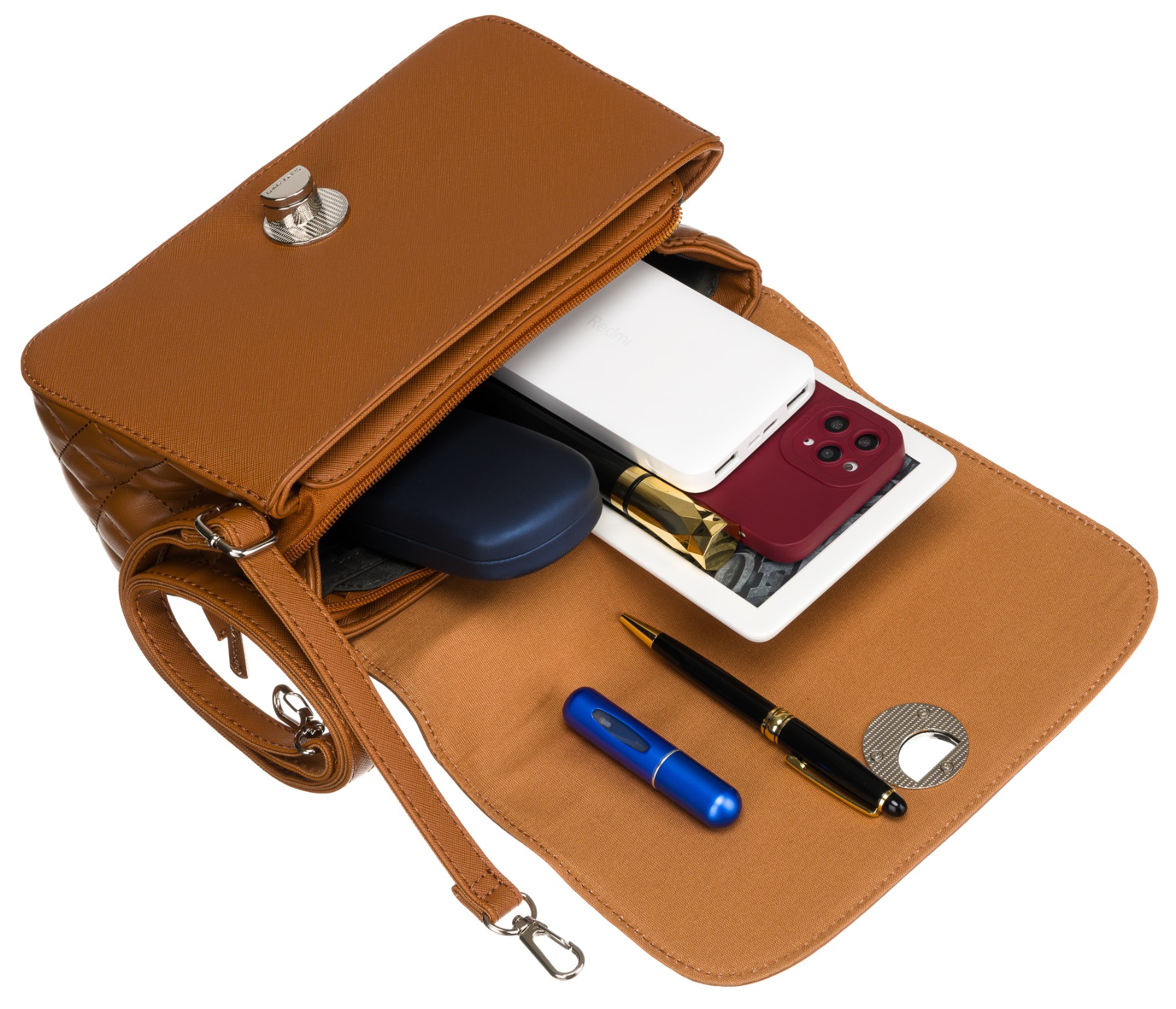 | Torba čez ramo, obešena na dolg, nastavljiv trak z masivnim kovinskim zapiranjem. Poleg tega ima ročaj za nošenje v roki. |