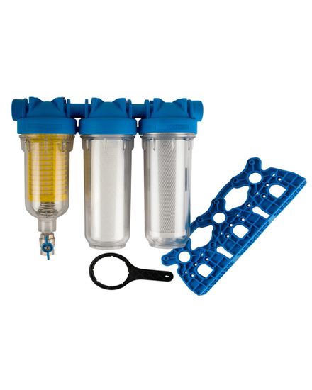 Sestavljeni kompleti so namenjeni montaži na vhodu vode v objekt. Izpiralni trojček je sestavljen iz filtrirnega vložka mehanski Hydra, ki odstranjuje mehanske delce. Sledi mu filtrirni vložek polipropilen, ki odstranjuje fine delce kot so mulj, pesek in obarvanost vode. Filtrirni vložek z aktivnim ogljem KDF pa iz vode odstrani klor, vonj ter slab okus.