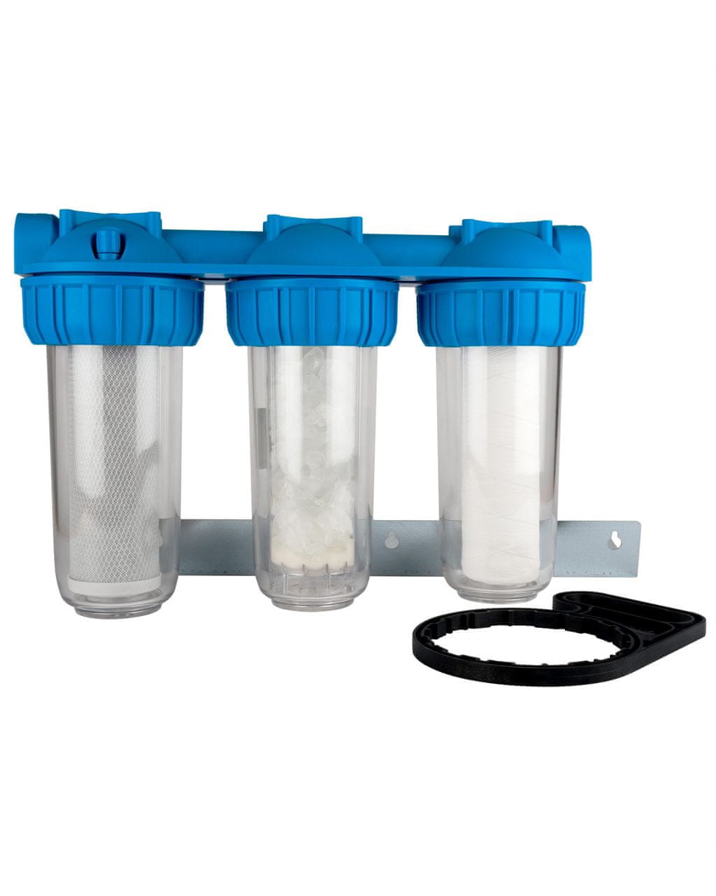 Sestavljeni kompleti so namenjeni montaži na vhodu vode v objekt. Mehčalni trojček je sestavljen iz filtrirnega vložka s polifosfati, ki učinkovito preprečujejo nalaganje vodnega kamna na grelnikih in notranjosti vodovodnih cevi. Pleteni filtrirni vložki iz vode odstranjujejo fine delce kot so mulj, pesek in obarvanost vode. Sledi doziranje polifosfatov v vodo, ki učinkovito preprečuje nalaganje vodnega kamna na grelnikih in v notranjosti vodovodnih cevi. Zadnji filter je filter, ki vsebuje aktivno oglje in iz vode odstranjuje klor, slab vonj ter okus.