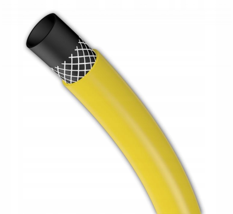 • 3-slojna vrtna cev, ojačana • Iz mehkega PVC-ja • 1. sloj – notranji, iz črnega PVC-ja, odporen na UV-žarke in nabiranje alg v cevi 2. sloj – prečna pletenica iz sintetičnih vlaken 3. sloj – zunanji, prozorno rumen, iz mehkega PVC-ja