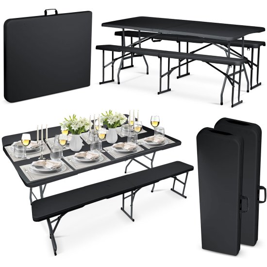 shumee Vrtni komplet za catering, zložljiva miza + 2 klopi 180 cm Plonos črne barve