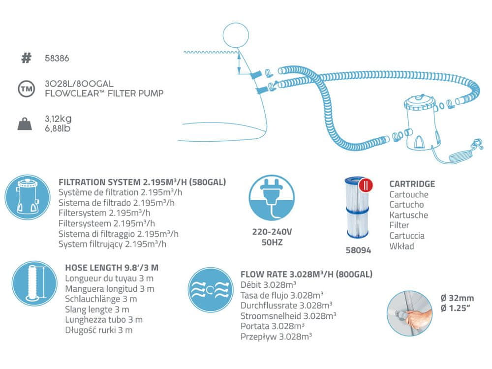 Črpalka s filtrom FLOWCLEAR™ vam bo pomagala ohranjati vodo čisto, tako da ste lahko prepričani, da lahko vi in vaši otroci v vročih dneh dihate in se ohladite z občutkom varnosti. Filtrirna črpalka je nenadomestljiva rešitev za izboljšanje kakovosti vode v vašem bazenu.
