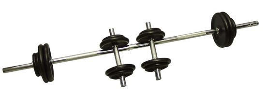 Komplet s premerom 25 mm – dvokrilna hupa + 2× enokrilna 70 kg. Dvoročna palica tehta približno 7 kg, 160 cm z navojem – 25 mm, 2 enoročni gredi imata po 2 kg, preostanek skupne teže 70 kg predstavljajo diski v sestavi 2 × 10 kg, 4 × 5 kg, 6 × 2,5 kg itd. (Komplet je zaradi večje teže razdeljen na 3 škatle).