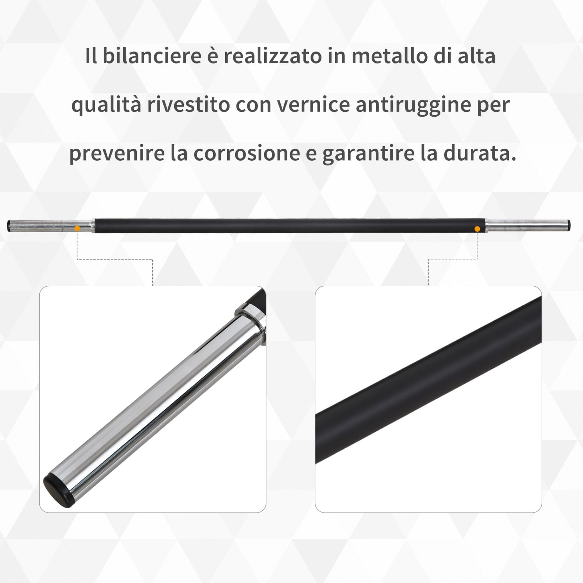 HOMCOM štanga z 20 kg utežmi je vsestranski izdelek, ki vam lahko pomaga okrepiti postavo. Po montaži, ki traja le nekaj sekund, se lahko posvetite vajam s štangami, s katerimi krepite mišično moč, vzdržljivost in zdravje srca in ožilja. Diski so izdelani iz težkega jekla, palica pa iz votlega jekla in so izjemno odporni proti obrabi, zato so primerni za vsakodnevno uporabo. S stalno vadbo oblikujte popolno postavo.Vsebine: