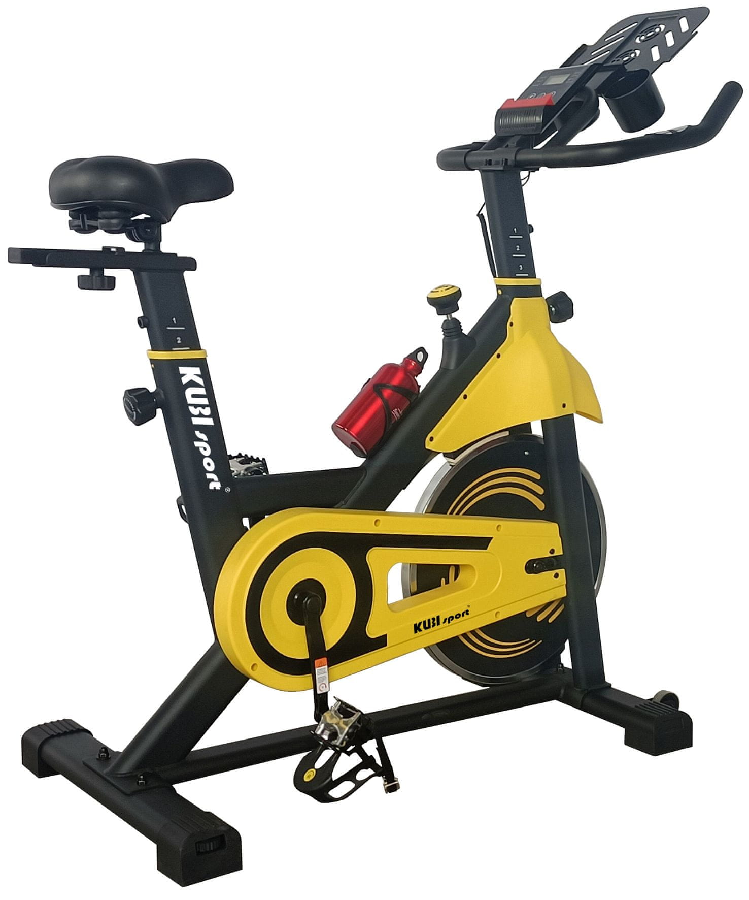 V opremi trenažerja ne manjkajo kolesarski števec, držalo za pijačo ter držalo za telefon ali tablični računalnik. Tako boste imeli, ko se boste lotili vadbe, pri roki ne le potrebne tekočine, temveč tudi svoje najljubše aplikacije za ocenjevanje vadbe ali gledanje serij. Poleg tega lahko z vgrajenega računalniškega zaslona enostavno preberete vse pomembne parametre. Parametri, ki jih lahko spremljate, vključujejo čas, razdaljo, kalorije, hitrost in, zahvaljujoč senzorjem, vgrajenim v ročajih, srčni utrip.
