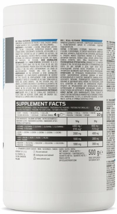 BCAA + Glutamin 500g Prehransko dopolnilo OstroVit BCAA + Glutamin je visokokakovostno prehransko dopolnilo, ki zagotavlja vir L-glutamina in aminokislin z razvejano verigo L-levcin, L-izolevcin in L-valin. Ima osvežujoč okus po limoni in je na voljo v priročni obliki praška. Ta izdelek je namenjen športnikom in telesno aktivnim posameznikom, ki želijo svojo dnevno prehrano dopolniti z dragocenimi aminokislinami. Vir aminokislin z razvejano verigo (BCAA) v razmerju 2:1:1 – en odmerek prehranskega dopolnila telesu zagotovi 2000 mg L-levcina, 1000 mg L-izolevcina in 1000 mg L-valina. Vsebuje L-glutamin – en odmerek pripravka vsebuje 4000 mg L-glutamina. Osvežujoč vonj po limoni, ki razvaja brbončice. Brez dodanega sladkorja – izdelek vsebuje nizkoenergijska sladila, kar prispeva k zmanjšanju energijske vsebnosti pripravka. 1 odmerek = 2,5 merice = 10 g. Učinkovitost – pakiranje izdelka vsebuje 50 odmerkov pripravka. Priročna oblika – pripravek je na voljo v obliki praška, kar zagotavlja nemoteno oskrbo s prehranskim dopolnilom in je idealen za ljudi, ki imajo težave s požiranjem tablet. OstroVit BCAA + Glutamin – vir dragocenih aminokislin. BCAA (aminokisline z razvejano verigo) so aminokisline z razvejano verigo. BCAA, kot že ime pove, so značilne po razvejani stranski verigi. BCAA vključujejo aminokisline, kot so L-levcin, L-izolevcin in L-valin. To so eksogene spojine, ki jih je treba telesu dovajati od zunaj, bodisi z vsakodnevno prehrano bodisi v obliki prehranskih dopolnil, saj jih telo ne more samo sintetizirati. BCAA predstavljajo približno tretjino beljakovin, ki sestavljajo mišično tkivo, in za razliko od drugih aminokislin je njihovo mesto razgradnje predvsem skeletne mišice, zaradi česar jih telesno aktivni posamezniki zlahka izkoristijo. L-glutamin pa je beljakovinska aminokislina, ki jo telo lahko naravno proizvaja. Kadar pa ima človeško telo povečane potrebe po tej dragoceni spojini, na primer med intenzivno telesno aktivnostjo, je smiselno spojino zagotoviti od zunaj, bodisi z vsakodnevno prehrano bodisi v obliki prehranskih dopolnil. L-glutamin se nahaja predvsem v mesu, ribah, jajcih, mleku in mlečnih izdelkih ter posušenih stročnicah. OstroVit združuje BCAA in glutamin, kar pozitivno vpliva na kakovost spojine, saj aminokisline, uporabljene v izdelku, kažejo sinergistične učinke in se dopolnjujejo. OPOMBA! Zaradi visoke vsebnosti L-levcina in L-izolevcina je za izdelek značilna manjša topnost in grenak priokus. To je naravna lastnost uporabljenih surovin. Izdelek je dobro zmešati z vodo ali sokom in raztopino nežno premešati, ali pa prašek zaužiti neposredno z vodo ali sokom. Navodila za uporabo: 10 g odmerek (2,5 merice) zmešajte v 100–150 ml vode ali soka. Na dneve vadbe popijte dva odmerka na dan: enega takoj po prebujanju, drugega po treningu. Na dneve brez vadbe popijte en odmerek po prebujanju. Ne prekoračite priporočenega dnevnega odmerka. Tega prehranskega dopolnila se ne sme uporabljati kot nadomestilo za raznoliko prehrano. Priporočamo uravnoteženo prehrano in zdrav način življenja. Ne uživajte, če ste alergični na katero koli sestavino. Tega izdelka ne smejo uporabljati otroci, nosečnice ali doječe matere. Hraniti izven dosega majhnih otrok. Sestavine: L-glutamin, L-levcin, emulgator: repični lecitin, L-valin, L-izolevcin, regulator kislosti: citronska kislina, arome, sladila: sukraloza, acesulfam K. Ta izdelek lahko vsebuje mleko (vključno z laktozo), sojo, arašide, druge oreščke, sezamova semena, žita, ki vsebujejo gluten, jajca, rake in ribe. Prehransko dopolnilo v prahu. Vsebuje sladila. Aktivne sestavine, na porcijo, na 2 porciji: L-glutamin, 4000 mg, 8000 mg; L-levcin, 2000 mg, 4000 mg; L-izolevcin, 1000 mg, 2000 mg; L-valin, 1000 mg, 2000 mg; Neto teža: 500 g. Prehranskih dopolnil se ne sme uporabljati kot nadomestilo za raznoliko prehrano ali zdrav način življenja. Ne prekoračite priporočenega dnevnega odmerka. Prehranska dopolnila shranjujte izven dosega majhnih otrok. Pred uporabo izdelka priporočamo, da preberete podrobne informacije na embalaži ali priloženi navodili. Pogoji shranjevanja: Hranite v tesno zaprti posodi. Na suhem in hladnem mestu, izven dosega otrok. Zaščitite pred svetlobo. Proizvajalec: OstroVit Sp. z o.o., Sitarska 16, 18–300 Zambrów