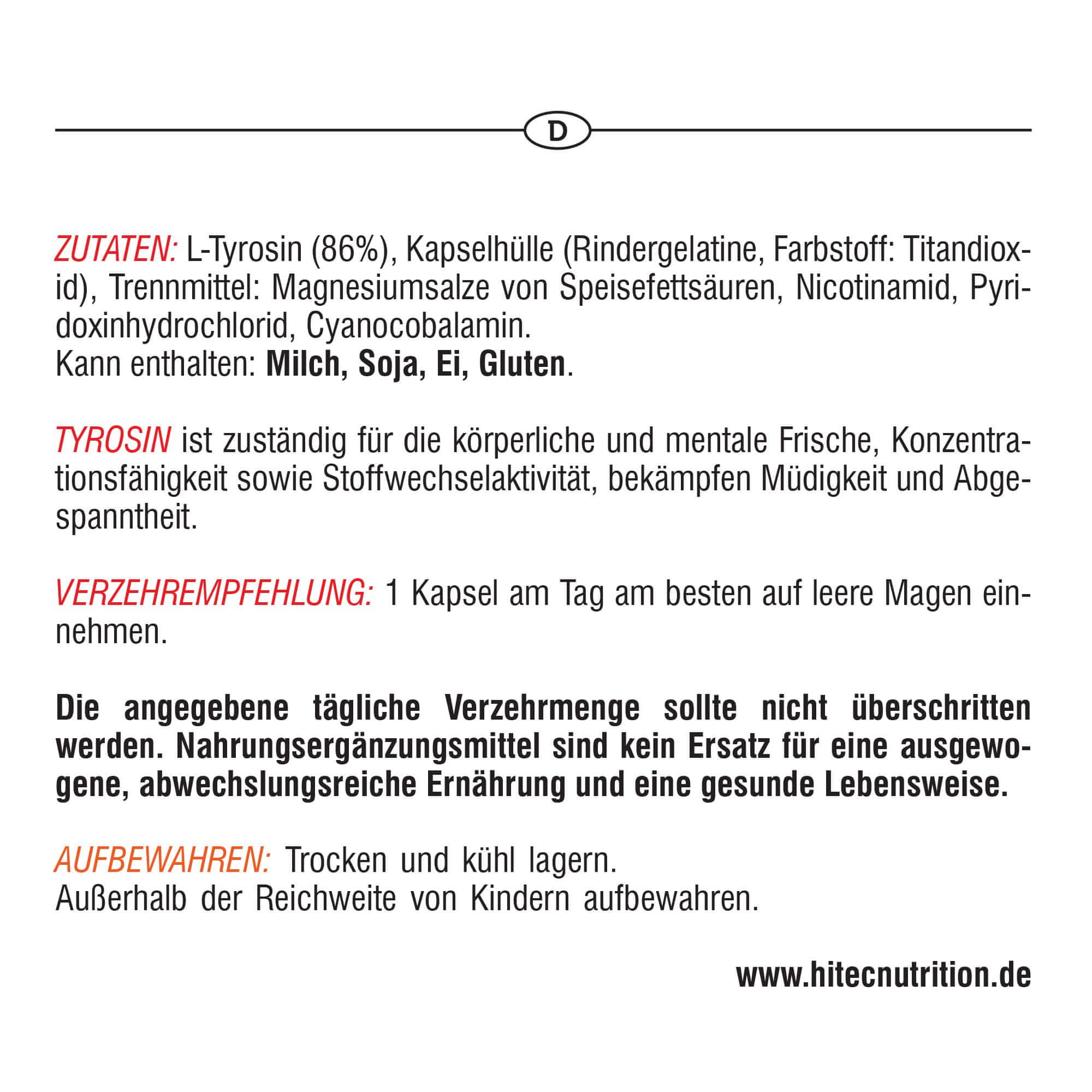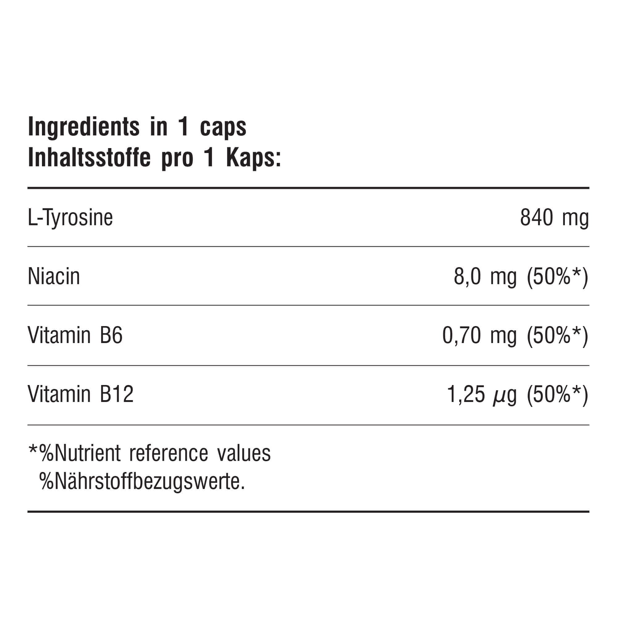 Tirozin je aminokislina, ki gradi mišične beljakovine in deluje kot predhodnik pri sintezi pomembnih nevrotransmiterjev centralnega živčnega sistema: dopamina, adrenalina in noradrenalina. Rezerve teh kemičnih spojin se med akutnim ali kroničnim stresom, povezanim z intenzivnim treningom ali intelektualnim naporom, hitro izčrpajo. Posledica zmanjšanja koncentracije teh nevrotransmiterjev je znatna izguba sposobnosti izvajanja telesne vadbe in upad intelektualne zmogljivosti. Optimalne koncentracije nevrotransmiterjev odpravljajo telesno in duševno utrujenost, ki je posledica dolgotrajnega, intenzivnega fizičnega napora, povečajo budnost, koncentracijo in hitrost mišljenja, izboljšajo dobro počutje in odpravljajo občutke depresije. Visoke ravni tirozina v krvi povzročajo stanje telesne in čustvene pripravljenosti ter vitalnosti. Tirozin učinkovito preprečuje utrujenost, pomaga ohranjati telesno pripravljenost ter omogoča živčnemu in endokrinemu sistemu (hipotalamično-hipofizno-nadledvični osi), da se hitro prilagodita stresu. Tirozin je tudi substrat za sintezo ščitničnih hormonov: tiroksina in trijodotironina, ki uravnavata presnovo in pomagata ohranjati zdravo telesno težo.