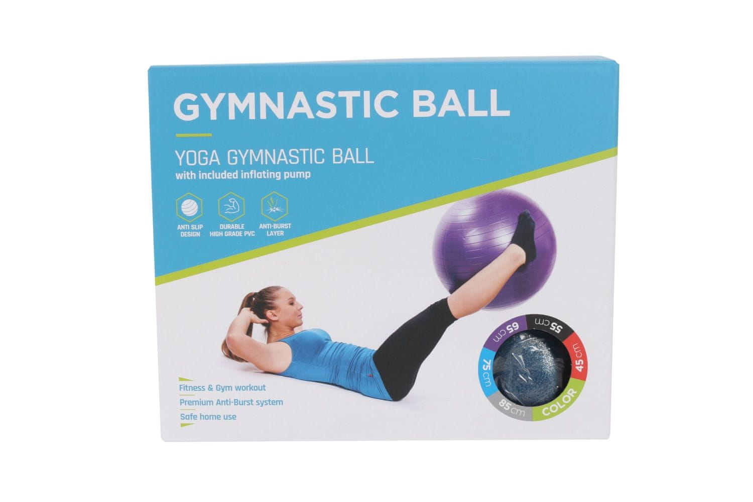 Z vadbo na žogi boste okrepili zadnjico, stegna, spodnji del hrbta in trebušne mišice. Žoga je narejena iz kvalitetnega Anti-brust materiala, ki ob morebitni poškodbi žoge omogoča, da zrak iz žoge uhaja postopoma.