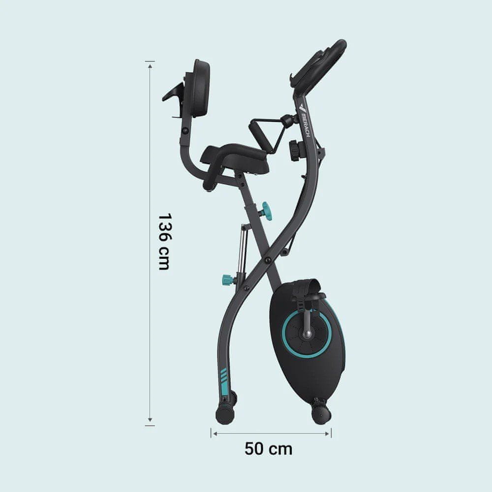 Merach S15B2 4-v-1 sobno kolo – črno Doživite popolno vadbo z Merach 4-v-1 sobnim kolesom: pokončno ali ležeče pedaliranje ter trening rok in hrbta. S 16 stopnjami magnetnega upora, interaktivnim LCD zaslonom, merjenjem srčnega utripa in udobnim sedežem. Zložljiva zasnova prihrani prostor in je idealna za domačo uporabo. Ključne lastnosti Zložljivo Z LCD zaslonom Merjenje srčnega utripa 16 stopenj magnetnega upora Nosilnost: 136 kg Interaktivni LCD zaslon Nosilec za steklenico Nastavljiva višina sedeža Elastični trakovi za vadbo rok in hrbta Primerno za višino uporabnika 132–185 cm Omogoča pokončno in ležečo vadbo ter trening rok in hrbta 4 v 1 – Večnamenski dizajn Ta inovativna zložljiva zasnova ponuja pokončni in nagnjeni način vožnje, hkrati pa omogoča vadbo rok in hrbta. Omogoča različne fitnes načine in celostno vadbo za vse glavne mišične skupine. Izboljšan sedež in udobje Največje udobje V primerjavi s klasičnimi sobnimi kolesi je Merach S15B2 bistveno izboljšan glede udobja sedeža, saj ponuja več prostora in izjemno prijetno vožnjo. 16 stopenj magnetnega upora Preprosto prilagajanje intenzivnosti vadbe Izboljšan magnetni upor omogoča tišje in gladkejše delovanje, s 16 stopnjami pa lahko vedno prilagodite intenzivnost in ritem vadbe ter učinkoviteje dosežete svoje cilje. Odlična nosilnost in prilagoditev Izdelano iz visokokakovostnega jekla, s nosilnostjo do 136 kg. Nastavljiva višina sedeža – primerna za uporabnike visoke 132–185 cm. Kakovostni materiali Izboljšani materiali in barve zagotavljajo daljšo življenjsko dobo, odpornost proti obrabi in eleganten videz z zaščito proti svetlobi. Pametne funkcije za učinkovitejšo vadbo Interaktivni LCD zaslon prikazuje napredek v realnem času, nosilec za tablico pa omogoča spremljanje video vadb ali vsebin med vadbo. Magnetni sistem upora Magnetni mehanizem zagotavlja tiho in gladko delovanje, kar omogoča popolno osredotočenost na vadbo. Brezplačna aplikacija Merach Ponudba vključuje različne brezplačne tečaje in vadbene programe, osebne načrte vadbe ter sledenje podatkom v realnem času. Enostavno premikanje Osnova kolesa je opremljena s transportnimi kolesci, ki omogočajo enostavno premikanje brez napora. Tehnični podatki Zaslon: LCD Teža vztrajnika: 1,5 kg Obseg upora: 16 stopenj Vrsta upora: magnetni Vrsta pedal: nastavljivi Samodejni elektromagnetni sistem: ne Polnjenje naprave: da Bluetooth: da Nosilci dodatkov: nosilec za mobilni telefon/tablico, nosilec za steklenico Nosilnost: 136 kg Mere sestavljenega izdelka: 95 × 53 × 116 cm Teža izdelka: 18 kg