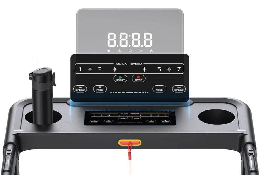 Nastavljiv naklon – 3 stopnje (0 %–3 %–6 %) za učinkovitejše kurjenje kalorij in maščob (do 40 % večja učinkovitost). Tekalna in sprehajalna steza v enem Blaženje udarcev – 5-slojni tekalni pas s 6 silikonskimi blažilci ščiti sklepe med vadbo. Pametno spremljanje – LED zaslon, merilnik srčnega utripa in brezplačna podpora aplikacije MERACH. Tiha in prostorsko varčna – raven hrupa 40 dB, zložljiva z eno roko, nosilec za tablico. Stabilna in univerzalna – nosilnost 120 kg, površina pasu 1080 × 420 mm, hitrost 0,8–12 km/h. Kurite več kalorij Tri stopnje naklona Tekalna steza Merach z nastavljivim naklonom omogoča tri stopnje (0 %–3 %–6 %), ki pomagajo pri učinkovitejšem kurjenju maščob. V primerjavi s klasičnimi stezami poveča učinkovitost vadbe do 40 %. Učinkovitejša vadba LED zaslon in daljinski upravljalnik Hitrost lahko prilagajate prek daljinskega upravljalnika ali neposredno na zaslonu. LED zaslon v realnem času prikazuje podatke o času, kalorijah, hitrosti, razdalji in srčnem utripu. Varna in udobna uporaba 5-slojni pas s 6 silikonskimi amortizerji Zložljiva tekalna steza je opremljena s petplastnim pasom in šestimi silikonskimi stebri za učinkovito blaženje udarcev – popolna zaščita kolen in gležnjev. Široka tekalna površina Površina 1080 × 420 mm, hitrostni razpon 0,8–12 km/h in nosilnost 120 kg zagotavljajo stabilno in udobno vadbo. Merilnik srčnega utripa in varnostni ročaji poskrbijo za dodatno varnost. Enostavno premikanje Vgrajen dvosmerni valj deluje po principu vzvoda, zato je premikanje steze preprosto in brez napora. Praktično zlaganje V zloženem položaju hidravlična palica prevzame več kot 90 % teže naprave, zato jo je mogoče zložiti z eno roko. Za razpiranje preprosto stopite na pedal – naprava se samodejno odpre v 5 sekundah. (Dimenzije zložene steze: 65 × 70 × 125 cm) Nizka raven hrupa Vgrajeni zvočno izolirani tekalni pas ohranja raven hrupa le 40 dB, kar omogoča tiho vadbo kadarkoli.