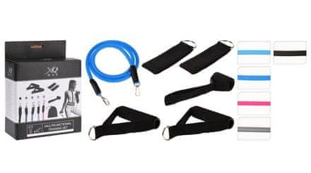 • nastavljiv gumijasti ekspander XQMAX z dodatki – komplet vsebuje skupno 11 kosov: – 5 x gumijasti ekspander z različno upornostjo – 2 x enoročni ročaji – 2 x trak za gleženj – sidro za vrata -.