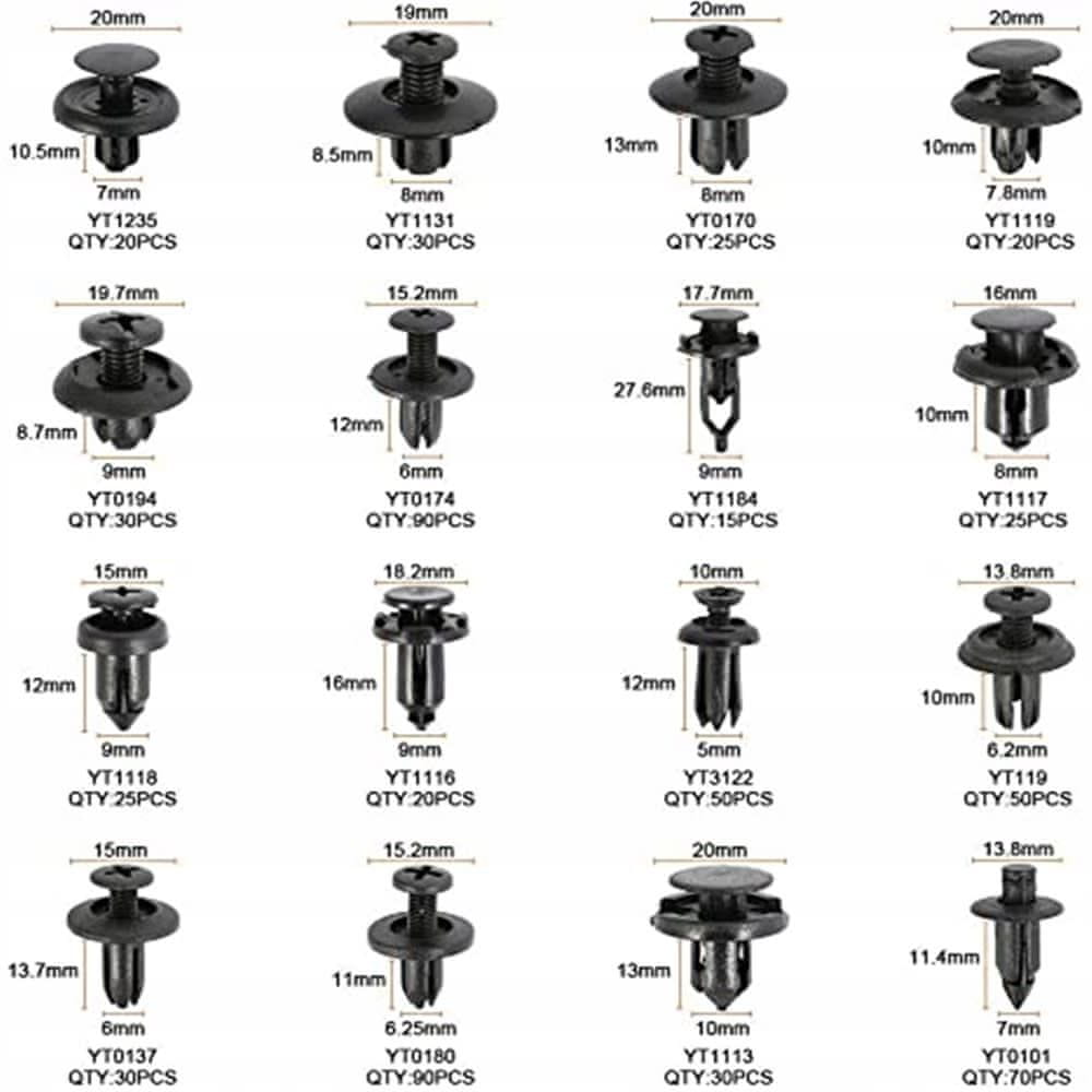 ✔️ Velikosti pritrdilnih elementov: Komplet vsebuje do 16 najbolj priljubljenih velikosti sponk, ki ustrezajo različnim tipom vozil in aplikacijam.