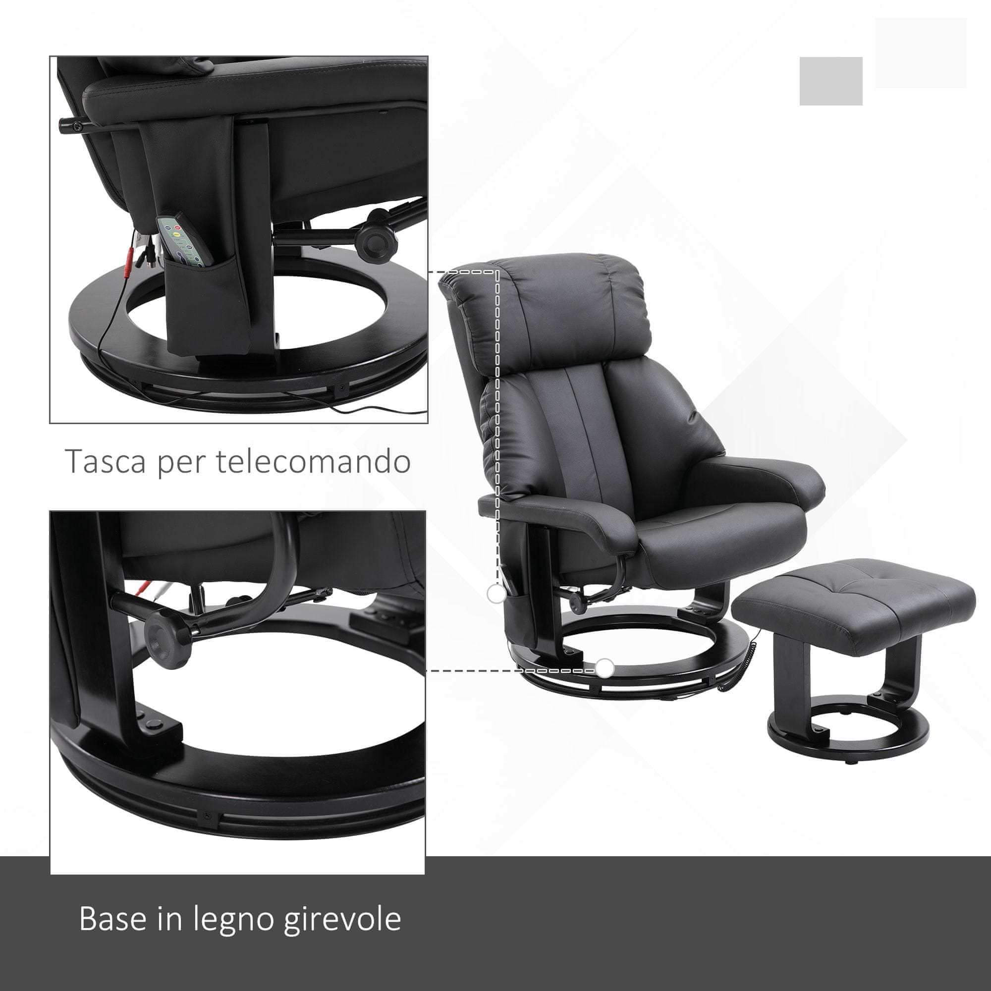 Funkcija segrevanja za spodbujanje krvnega obtoka2 stopnji intenzivnosti in 5 načinov delovanja za različne masažne izkušnje10 masažnih točk, 6 na hrbtu in ledvenem delu, 2 v blazini, 2 v naslonu za noge./li>Gosto oblazinjenje in 360° vrtljiva podlaga Priložen je naslon za noge Naslonjalo lahko nagnete do 145° Masažna funkcija se upravlja z daljinskim upravljalnikom, ki ga lahko nato priročno shranjen v žepu V elegantnem usnju, z ukrivljenim lesenim okvirjem Izdelek ima funkcijo mikro blokade (ni mogoče popolnoma zakleniti naslonjala)