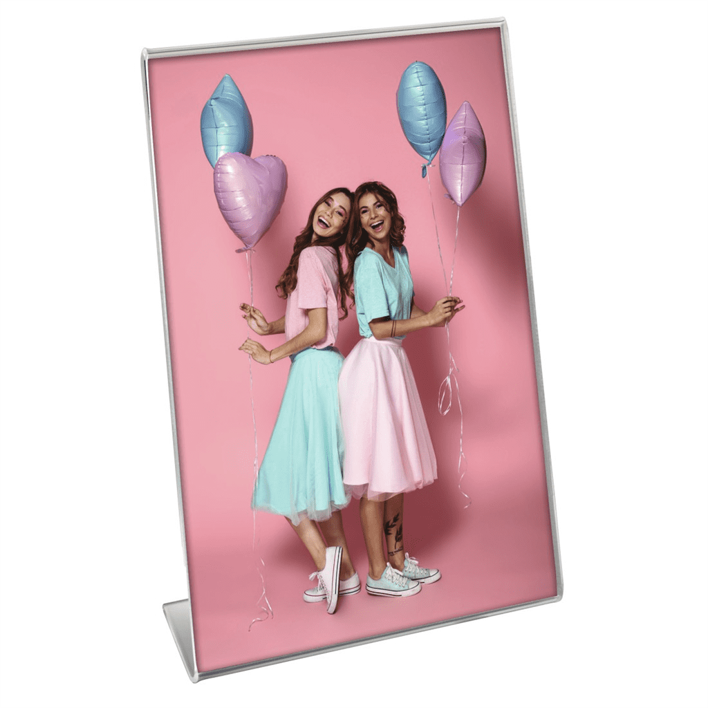 • preprost akrilni okvir v obliki črke L – idealen za predstavitev letakov, reklamnih ali informativnih plakatov itd., lahko ga postavite npr. na pult, poleg izdelka na polici itd. – navpični format …