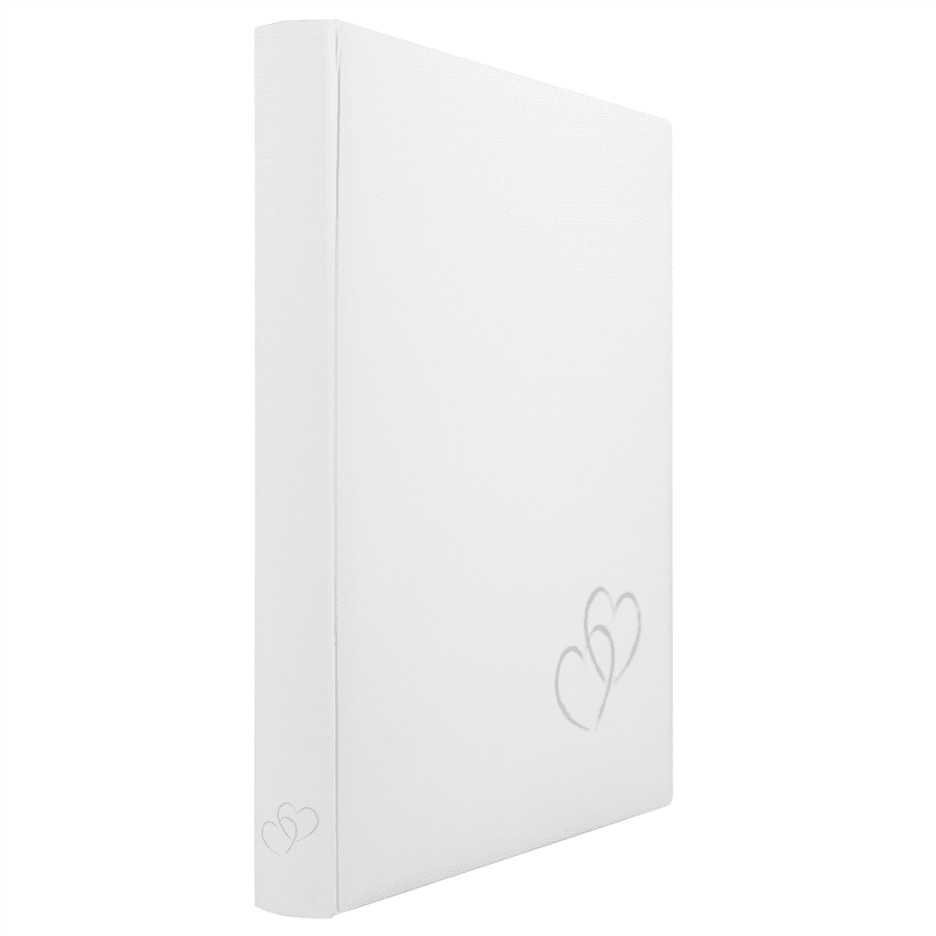 • album s poročnim motivom (dva srebrna srca na beli podlagi) – za lepljenje fotografij in ustvarjalno delo – klasičen videz knjige daje albumu eleganten, brezčasen videz – trdne laminirane plošče …