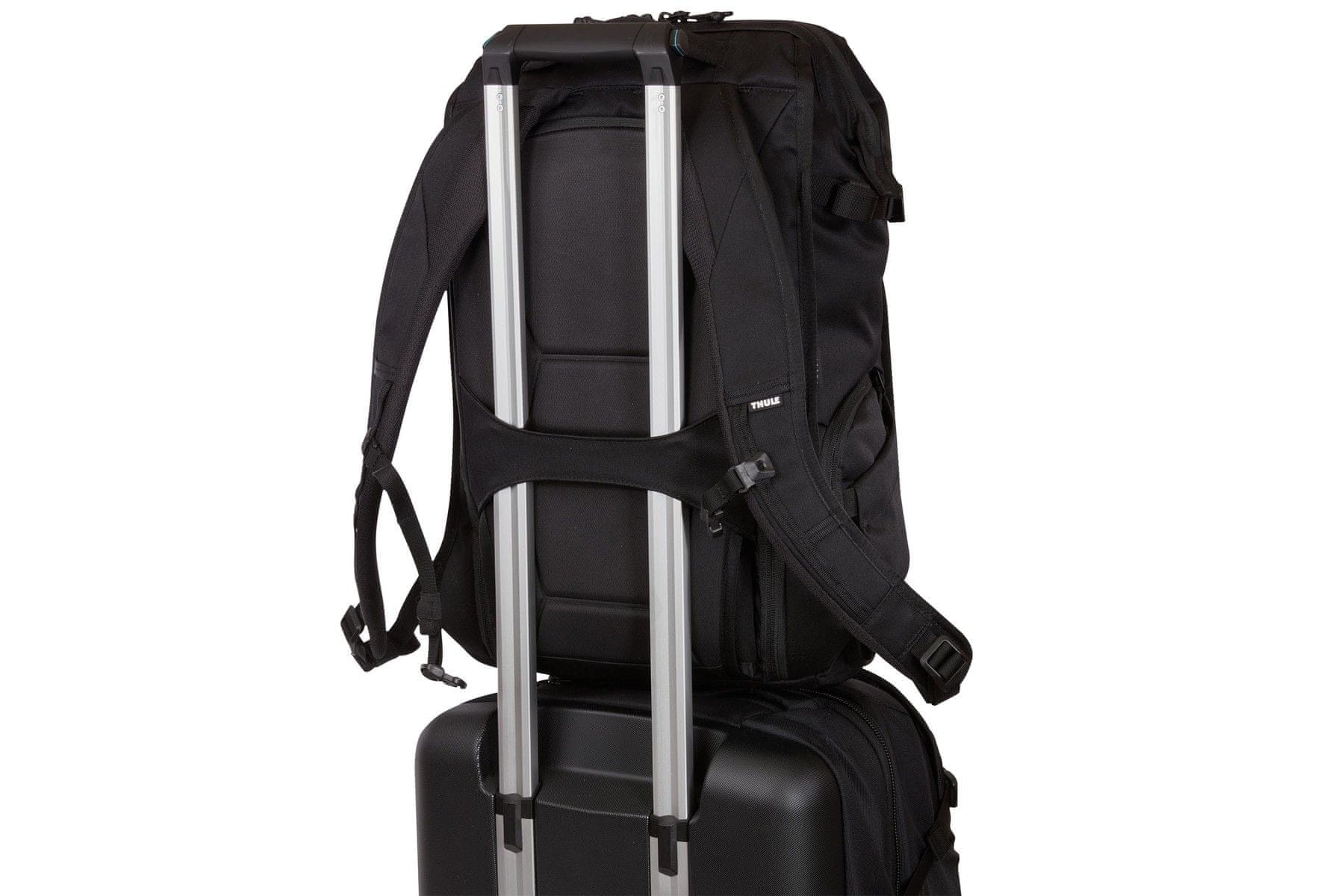 Med potovanjem lahko nahrbtnik s posebno široko elastiko na hrbtišču pritrdite na ročaj kovčka. Na strani ima elastične in razširljive žepe s pritrdilnim paščkom, kamor lahko pospravite npr. stojalo za fotoaparat. Za udobno nošenje ima oblazinjene in prilagodljive naramnice ter prsni in bočni pas, ki pripomoreta k enakomerni razporeditvi teže. Bočni pas lahko ob neuporabi tudi zatlačite v za to namenjen žep.