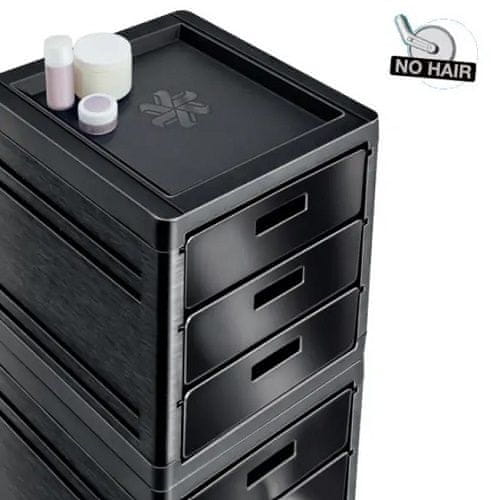 CERIOTTI Voziček za frizerskega pomočnika MY BLACK   Frizerski voziček iz materiala, odpornega na umazanijo, opremljen s 6 velikimi izvlečnimi predali za shranjevanje orodja. Estetski voziček na kolesih, s 6 predali, vsi izvlečni, zamenljivi, opremljen z notranjimi predali. Voziček je opremljen s stranskimi oporami za sušilce za lase in za posodice ali kozmetične stekleničke. Voziček je opremljen z ekskluzivnimi kolesi NO-HAIR Ceriotti, ki so višja in tanjša od „tradicionalnih“. kolesa, zmanjšanje stika s tlemi, zbiranje manj las.   Čas obdelave naročila – 7 dni. Proizvajalec: CERIOTTI Šifra izdelka: 7243