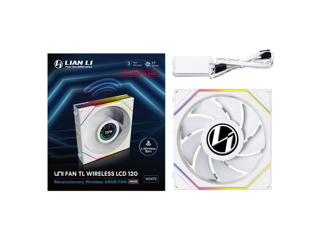 UNI FAN TL Wireless LCD Reverse Blade je 120 mm ventilator z obrnjenimi lopaticami, dvoconsko ARGB osvetlitvijo in vgrajenim 4 cm IPS LCD zaslonom (400 × 400 px). Upravlja se brezžično z L-Wireless kontrolerjem, kar poenostavi urejanje kablov. Zaslon podpira prikaz GIF/MP4/JPG/PNG datotek in podatkov o sistemu. Dosega 1900 r/min, pretok 54,3 CFM in hrup 31 dB. Ima hidrodinamični ležaj in modularno Pin-to-Pad zasnovo. Celoten opis