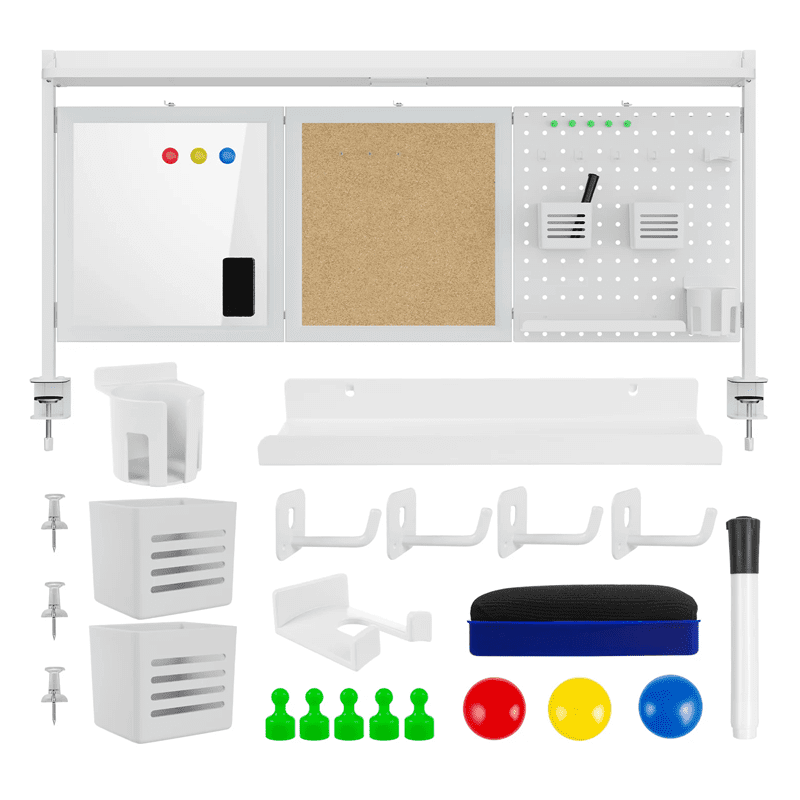 Večnamenski organizator za mizo ER-300W je kompaktna in izjemno praktična rešitev za ljudi, ki želijo organizirati svoj delovni prostor in imeti vse potrebne dodatke na dosegu roke. Organizator je opremljen z do tremi vrstami organizacijskih površin: magnetno tablo za suho brisanje, perforirano tablo in plutovinasto tablo.