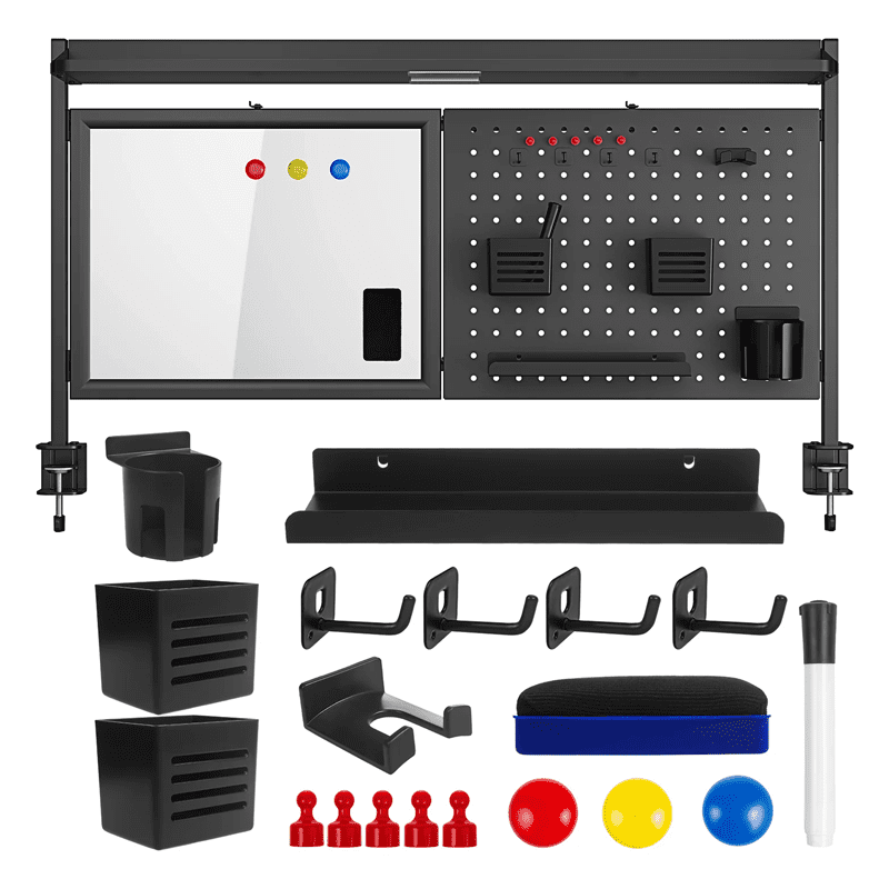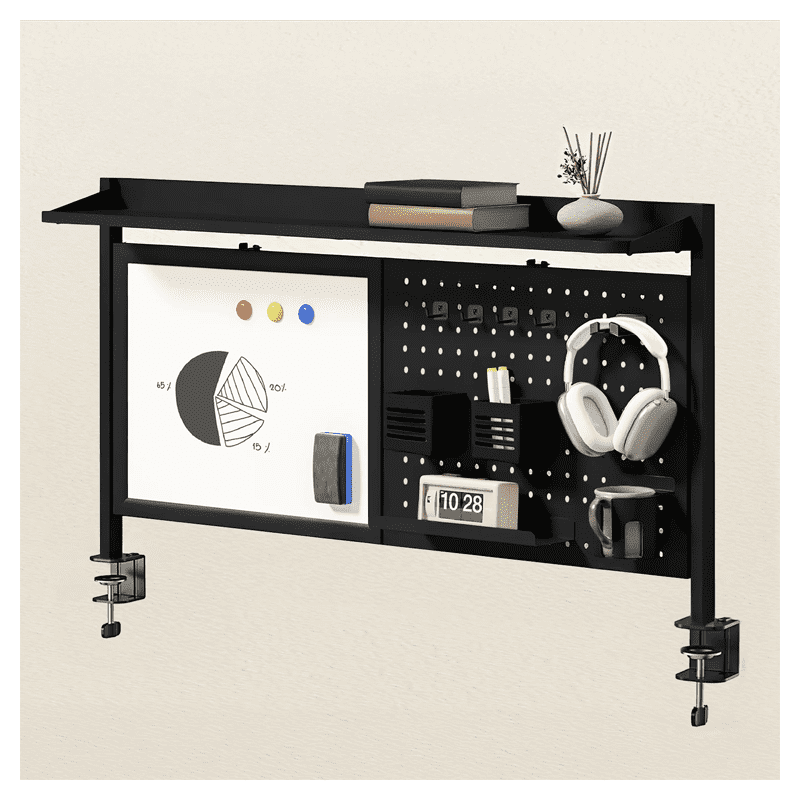 Večnamenski organizator za mizo ER-301B je kompaktna in izjemno praktična rešitev za ljudi, ki želijo organizirati svoj delovni prostor in imeti vse potrebne dodatke na dosegu roke. Osrednji del organizatorja ER-301 je magnetna tabla za suho brisanje, na katero lahko priročno pišete zapiske z markerjem (priložen) in jih brišete z gobico. Zraven je perforirana kovinska plošča, ki omogoča prosto razporejanje dodatkov. Opremljen je s štirimi kavlji, dvema posodicama za pisala, držalom za skodelice, polico ter kompletom 5 magnetnih zatičev in 3 magneti, kar vam daje popolno organizacijsko svobodo.
